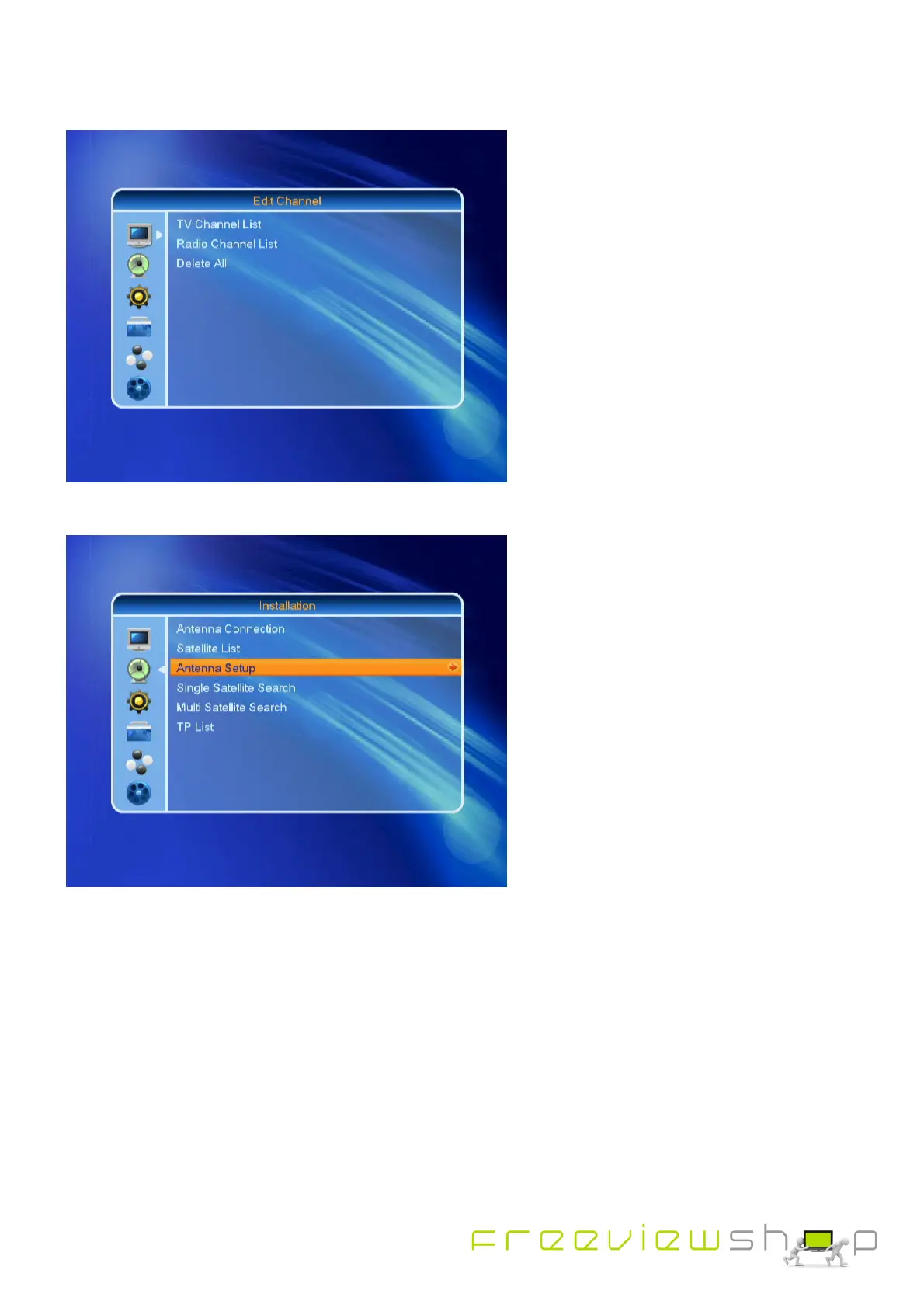 Scroll to Installation and press OK, then Scroll down to Antenna Setup and Press OK.