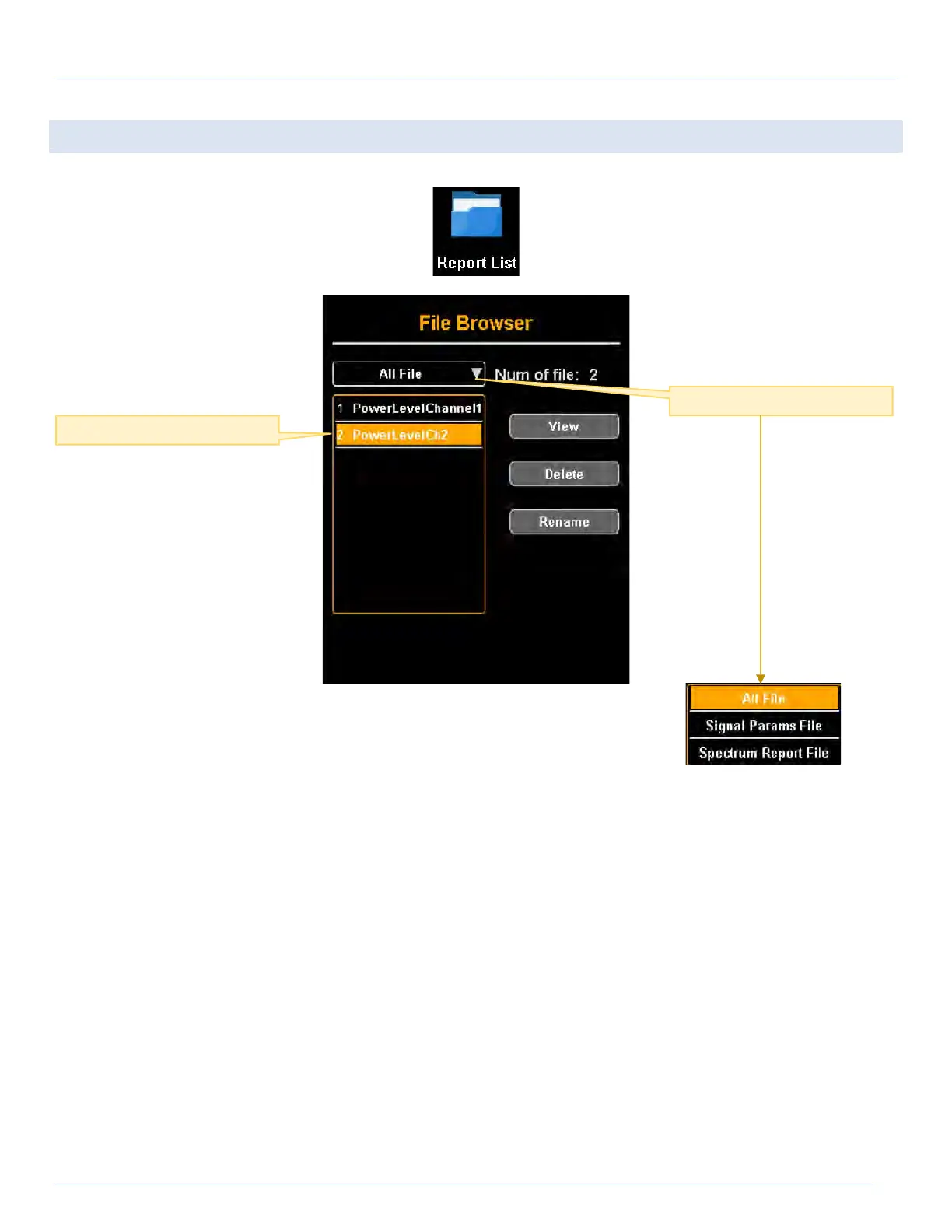 The Report List browses the file system stored on the instrument. Measurement report file can be viewed, deleted or