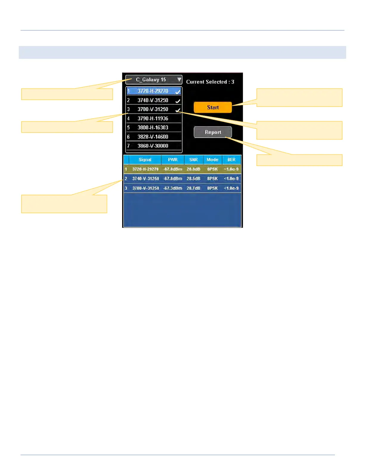 Multiple transponders of selected satellite can be scanned for power level, SNR, modulation type and BER.