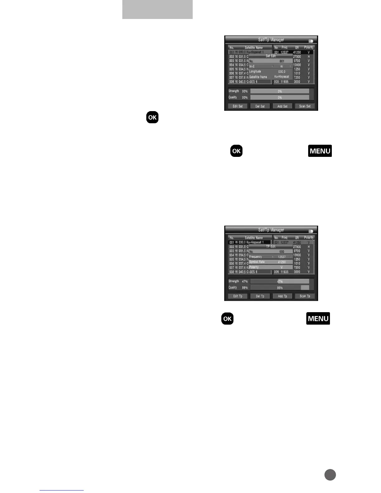 Press green key to delete satellite, then press OK to confirm or press MENU