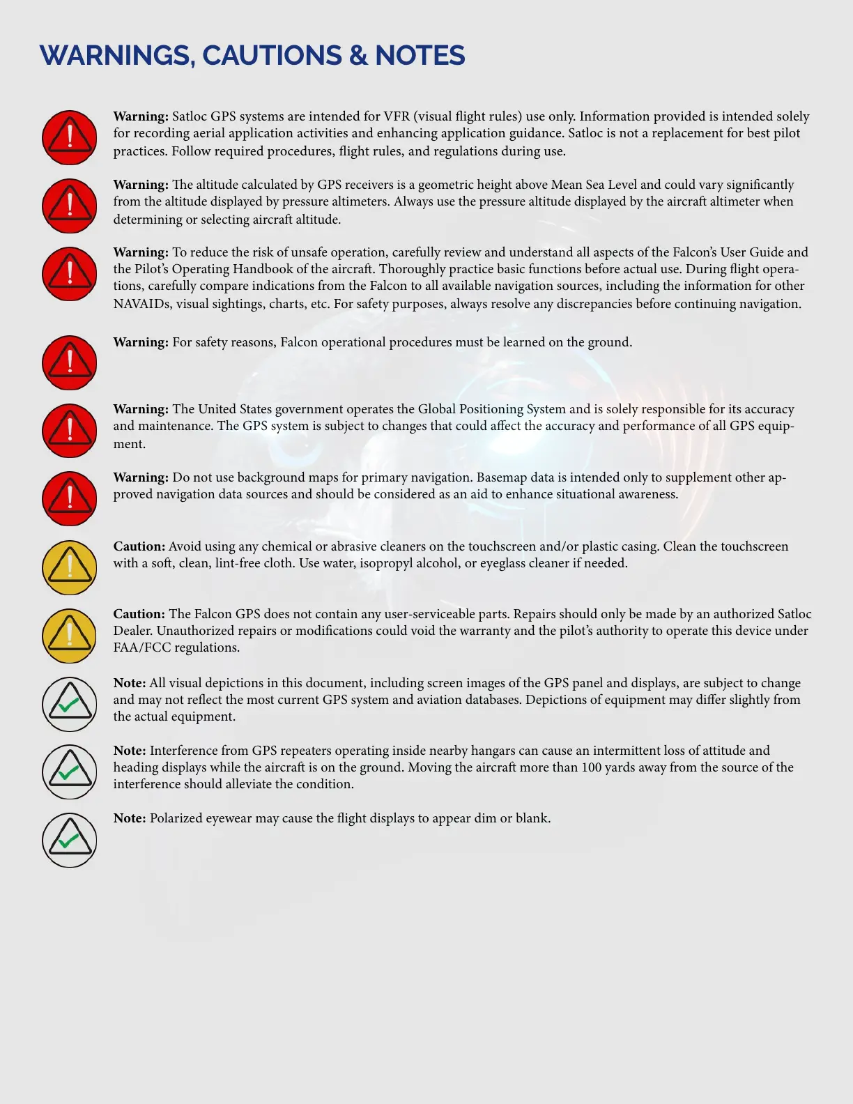 Warning: Satloc GPS systems are intended for VFR (visual ight rules) use only. Information provided is intended solely