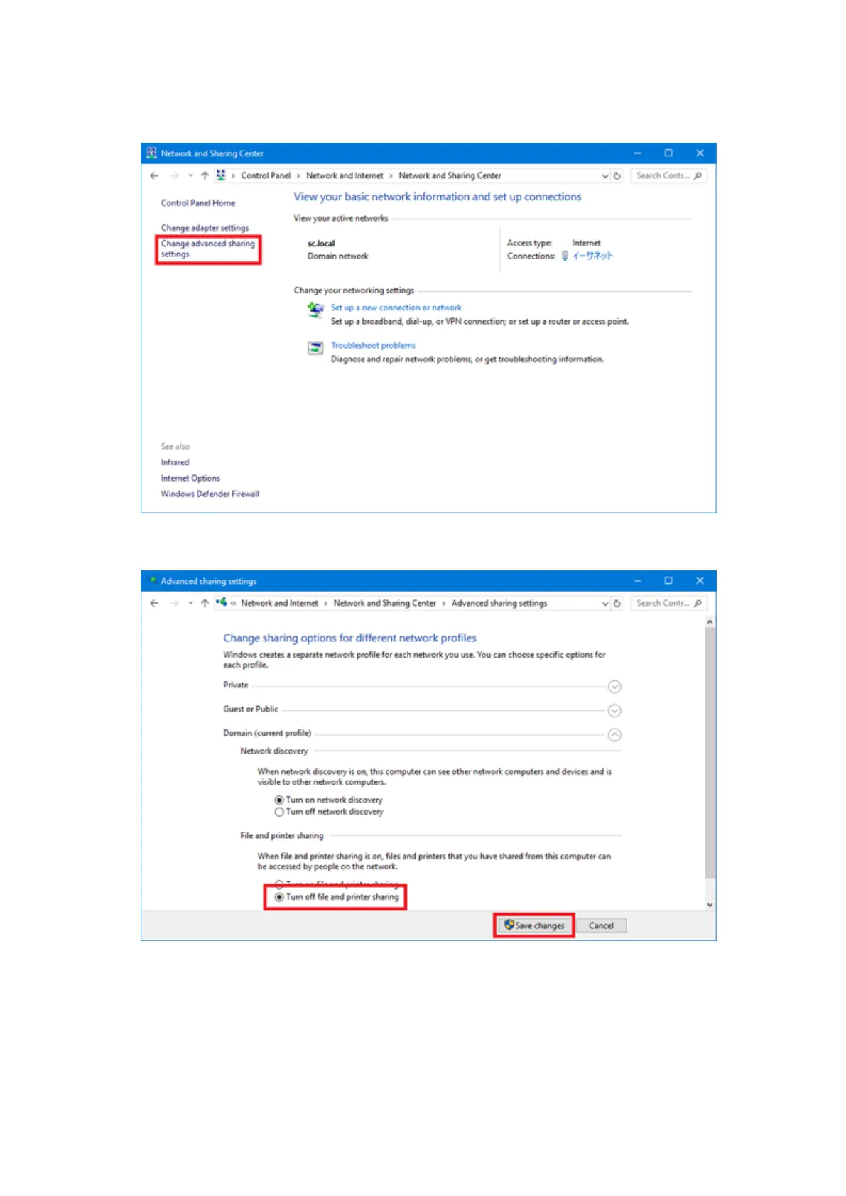 c. In [File and printer sharing], select [Turn off file and printer sharing] and click the [Save changes]