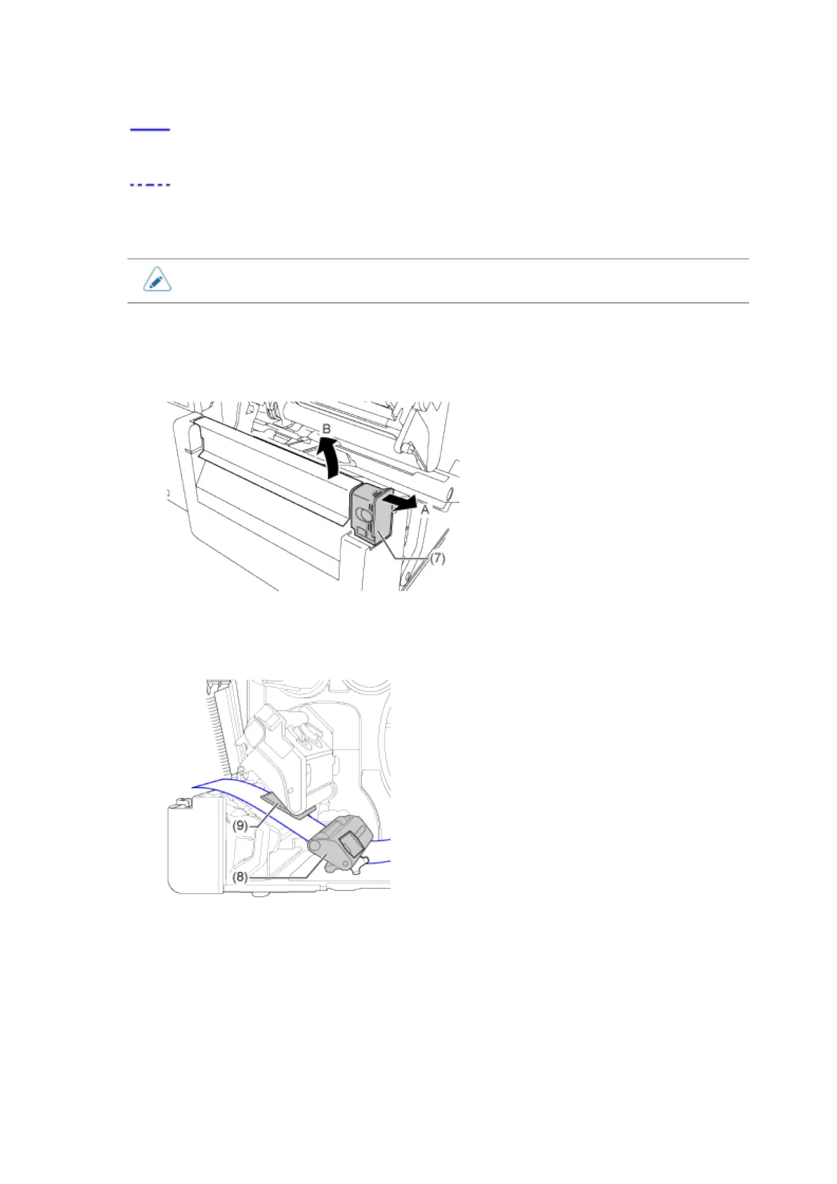 5. Pull the tab (7) of the cutter unit in the direction A, and then open up the cutter-