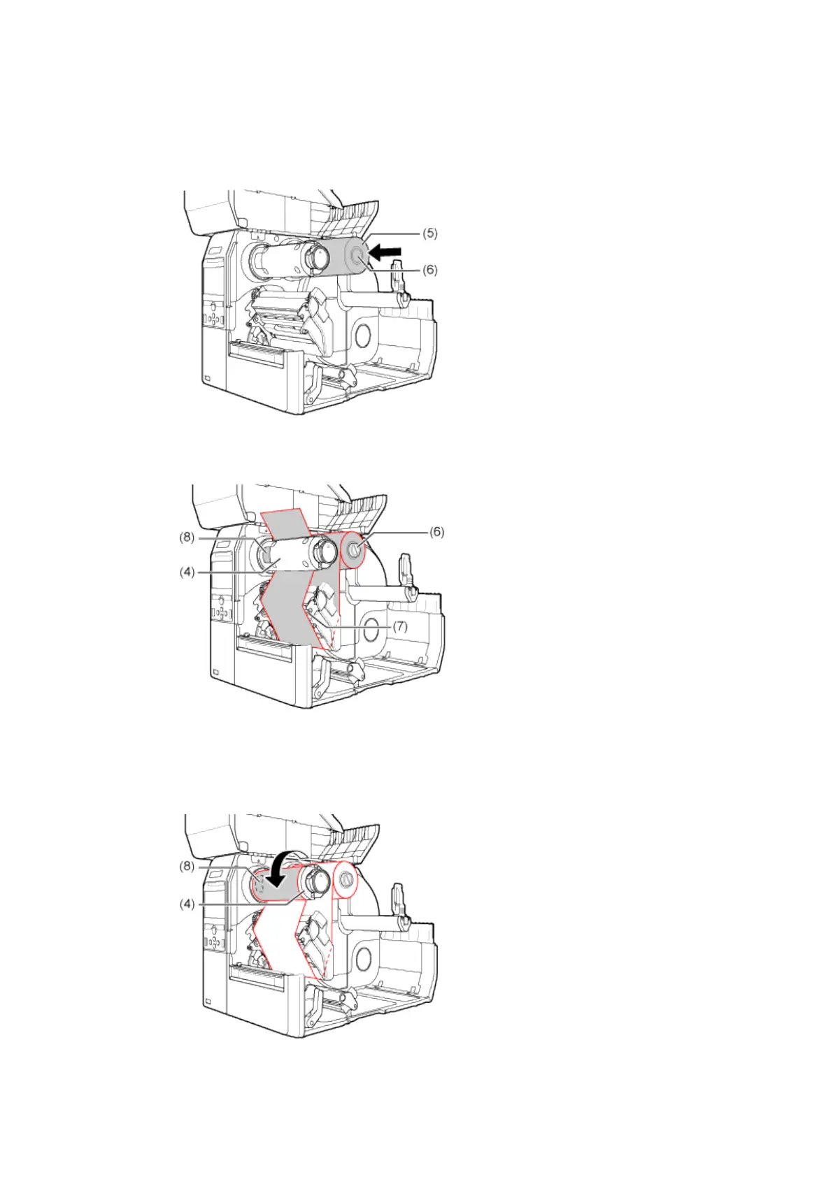 7. Load the ribbon (5) onto the ribbon supply spindle (6).