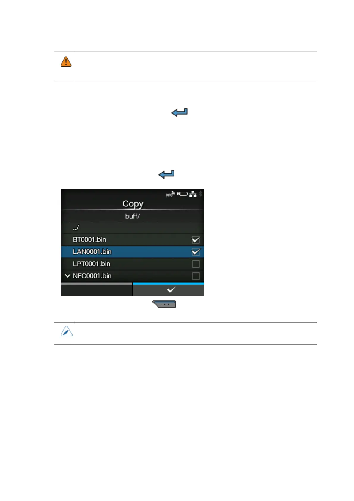 Select the file to copy and press the button. A check mark appears on the right side of the