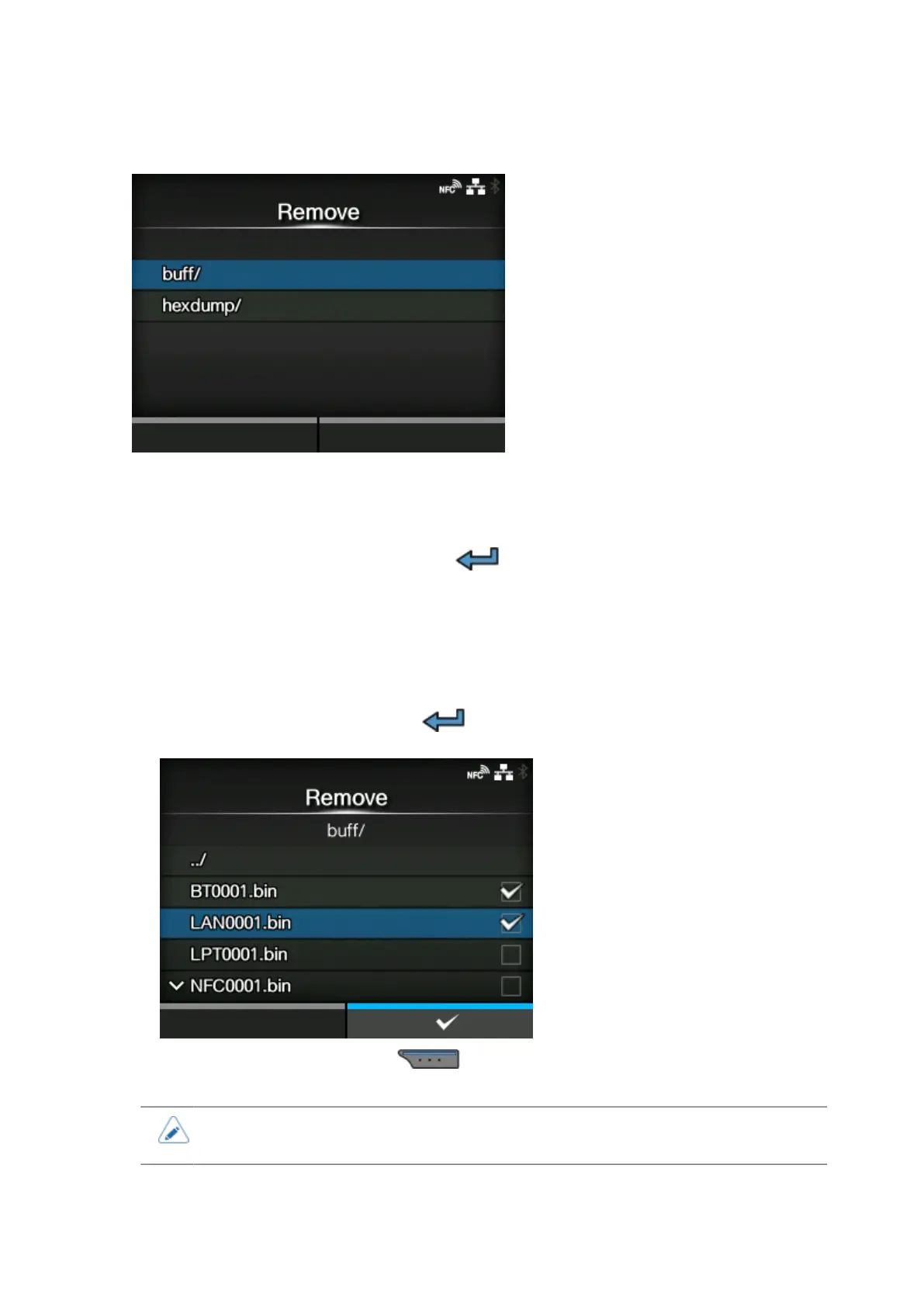 Select the file to delete and press the button. A check mark appears on the right side of the