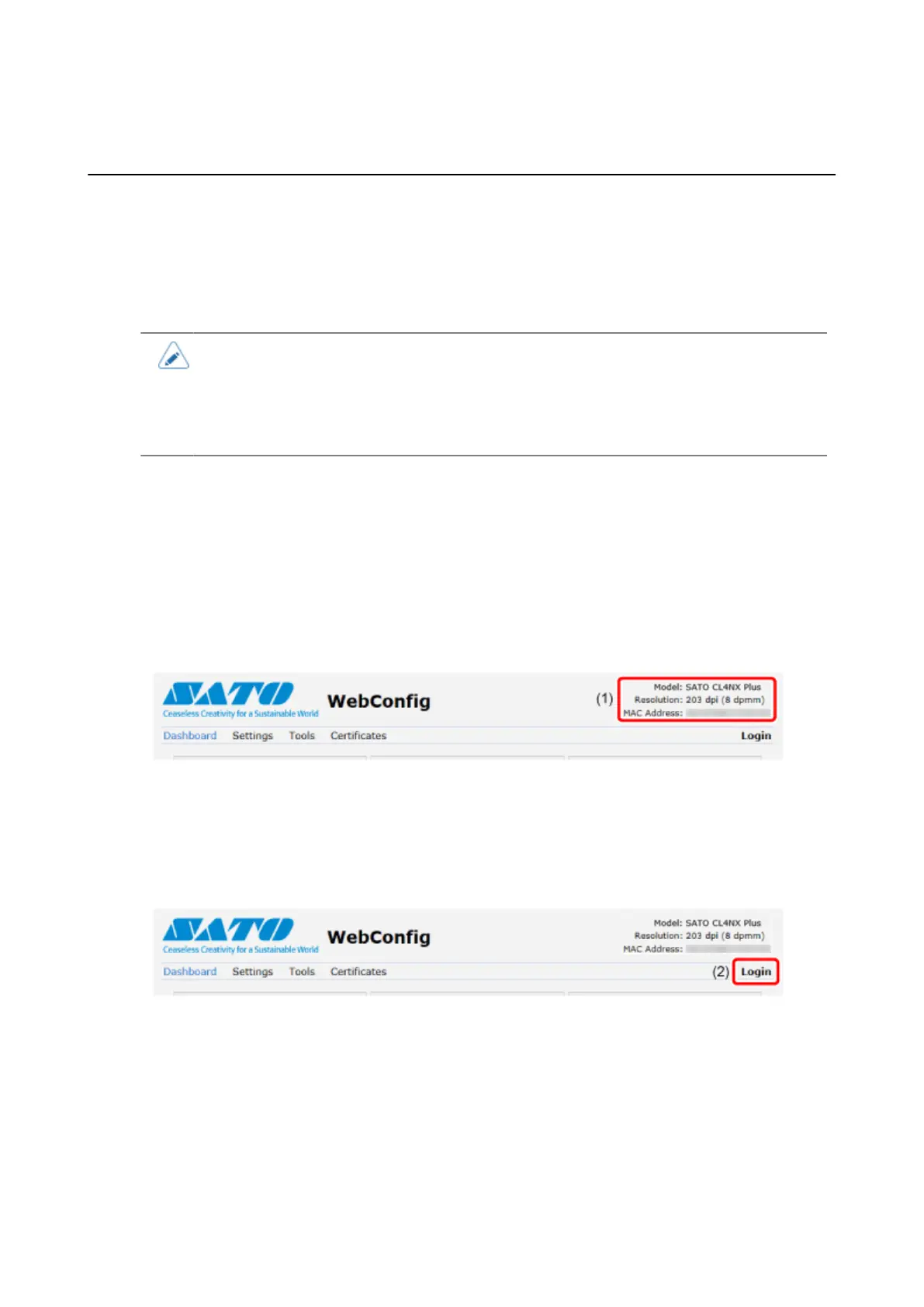 The web configuration page for the product appears. On the upper right (1) of each page, the