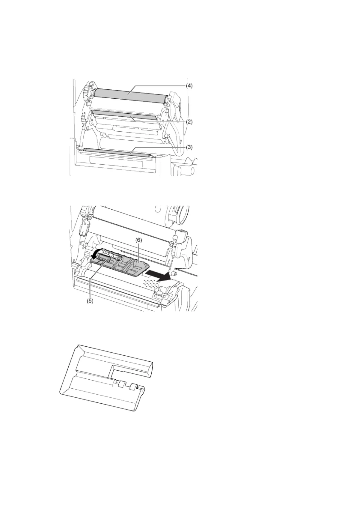 5. Clean the dirt on the print head (2), platen roller (3) and ribbon roller (4) using a