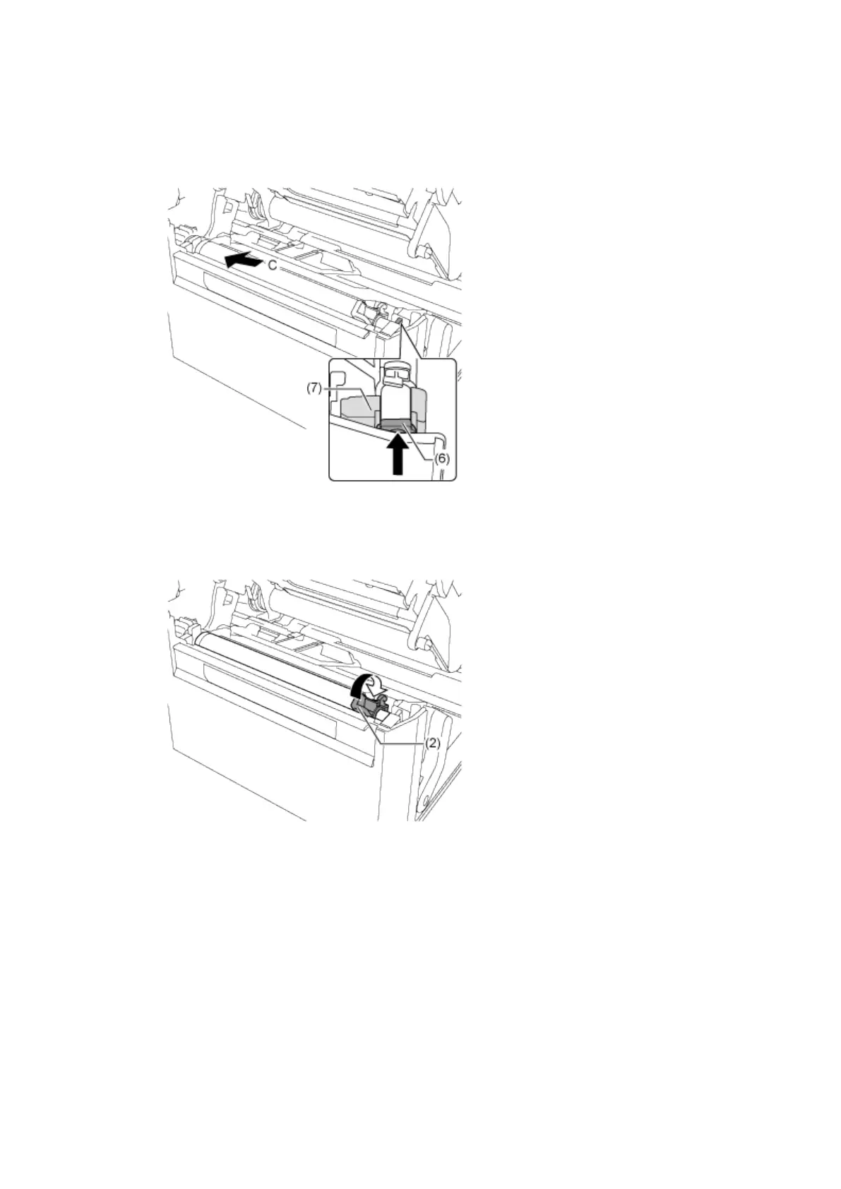 Push the platen roller again in the direction C so that the tab (6) is fixed in the groove (7) at the