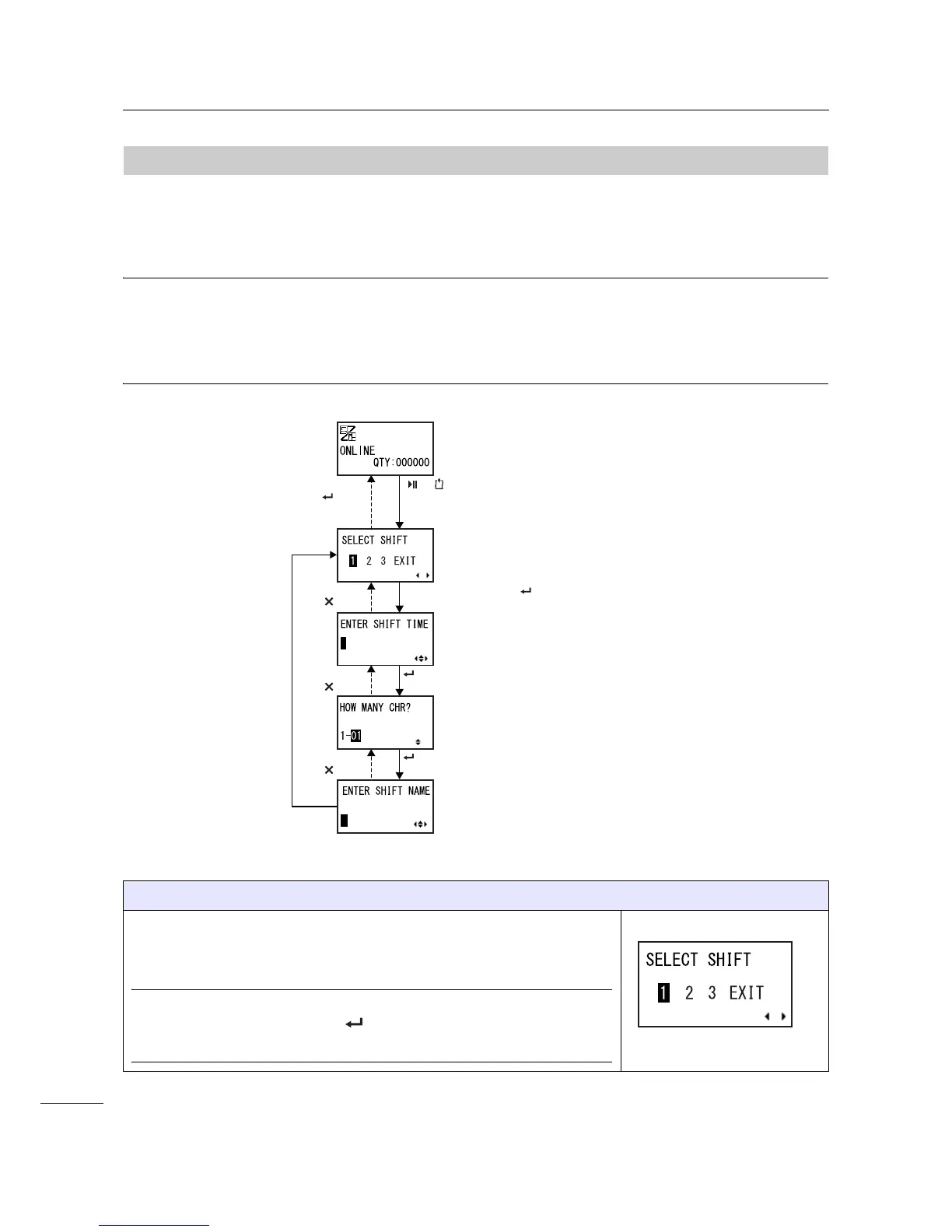 The flowchart shows the sequence of the setting screens for the work shift mode. The table describes
