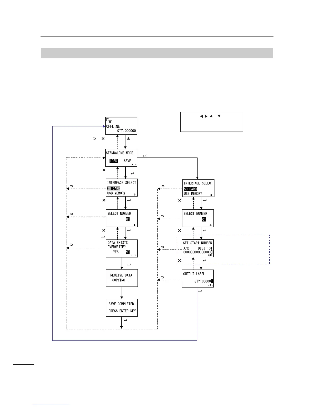The flowchart shows the sequence of the setting screens for the simple standalone mode. The table