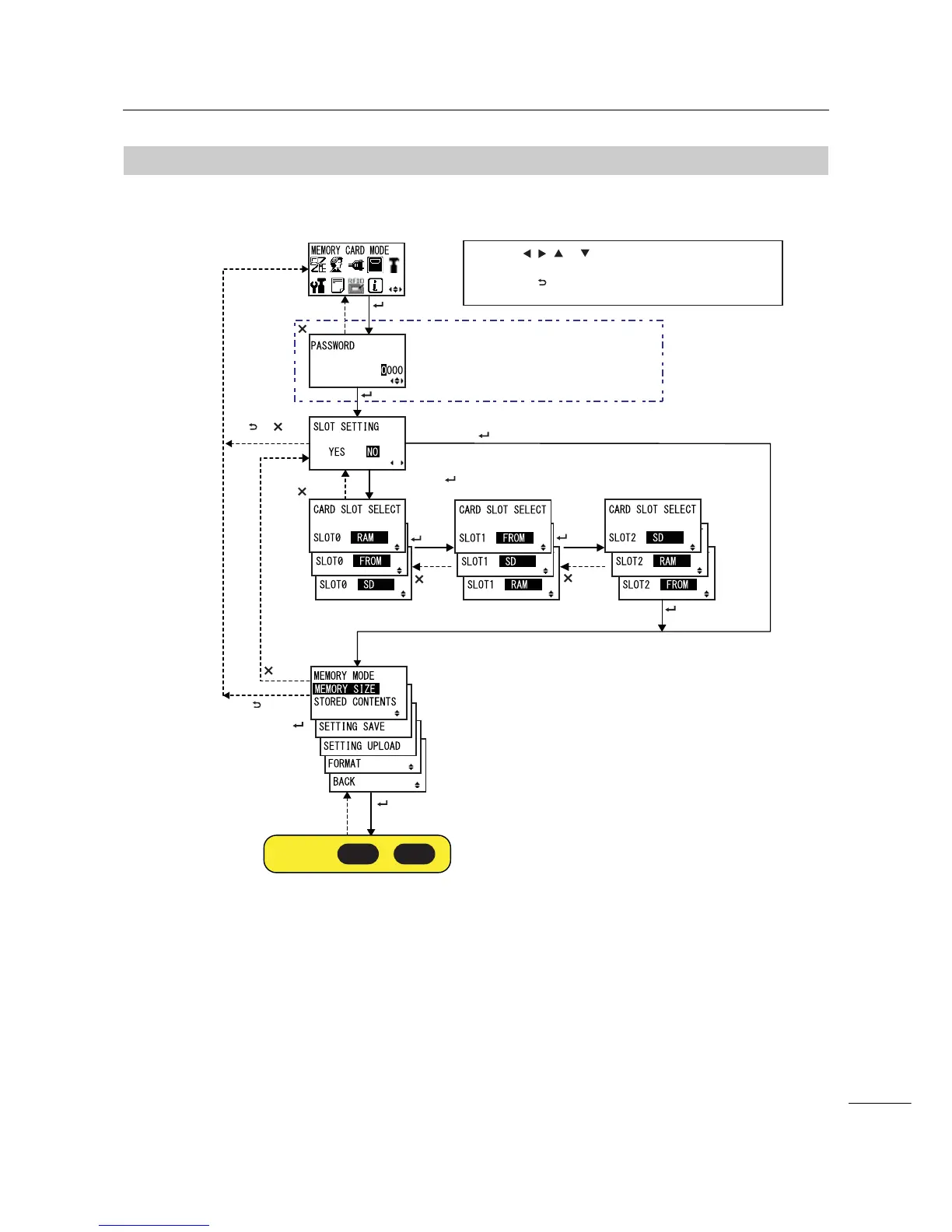 The flowchart shows the sequence of the setting screens for the memory mode. The table describes