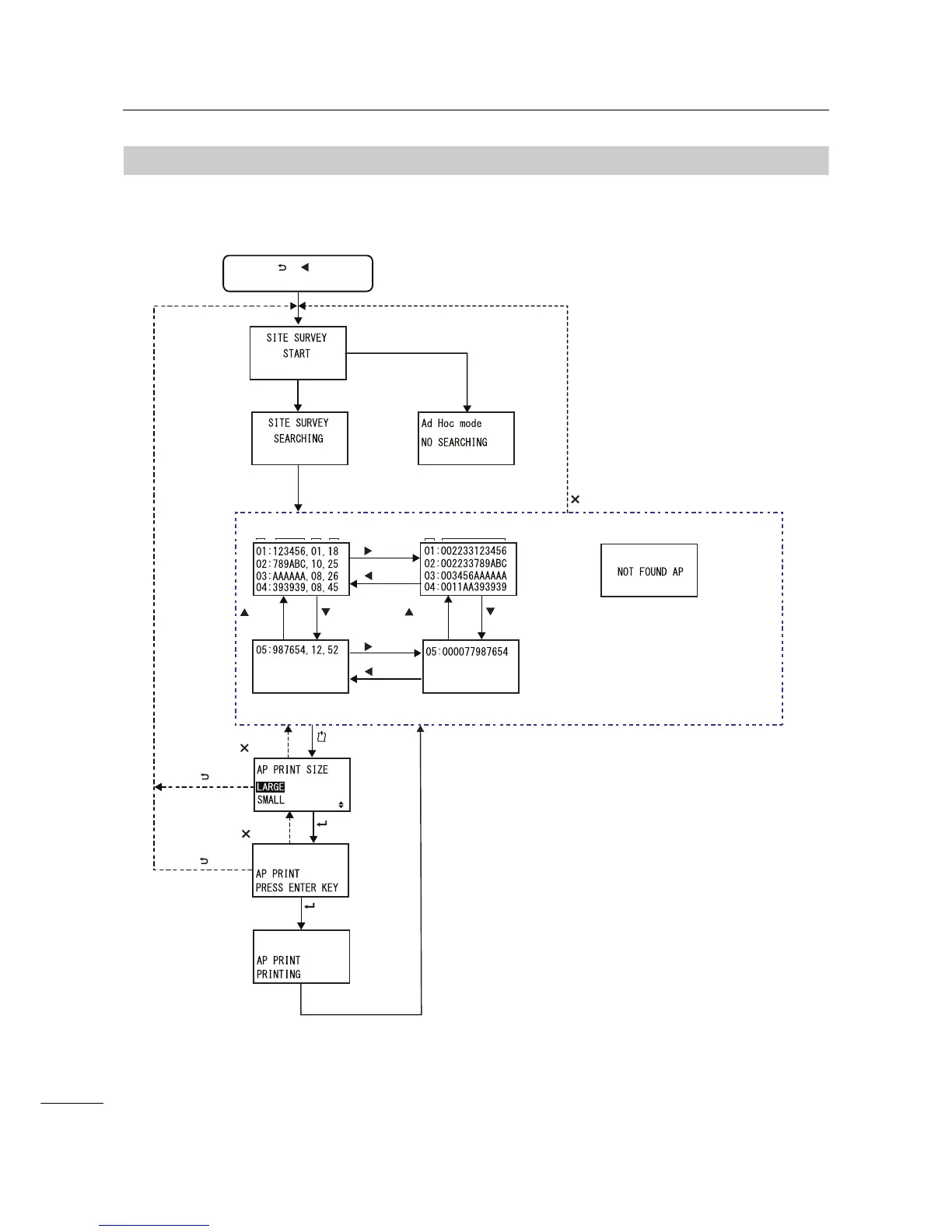 The flowchart shows the sequence of the setting screens for the site survey mode. The table describes