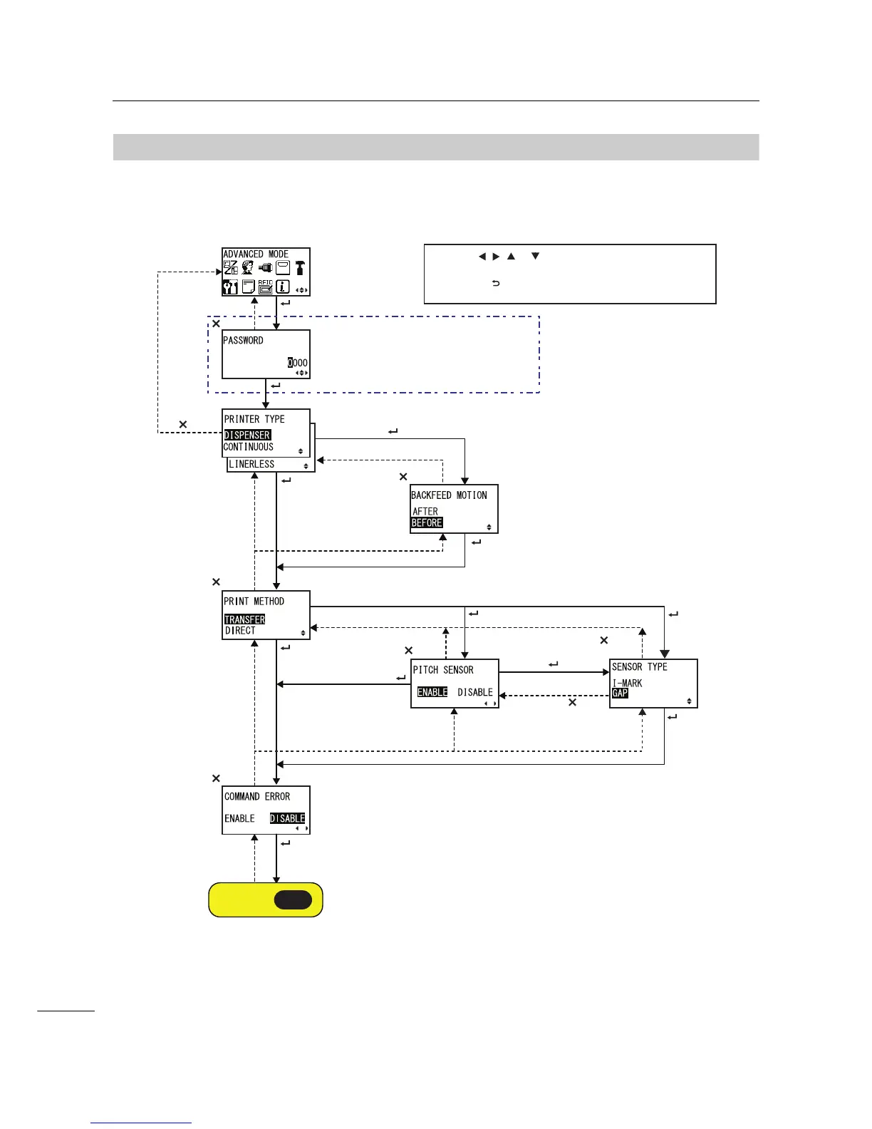 The flowchart shows the sequence of the setting screens for the advanced mode. The table describes