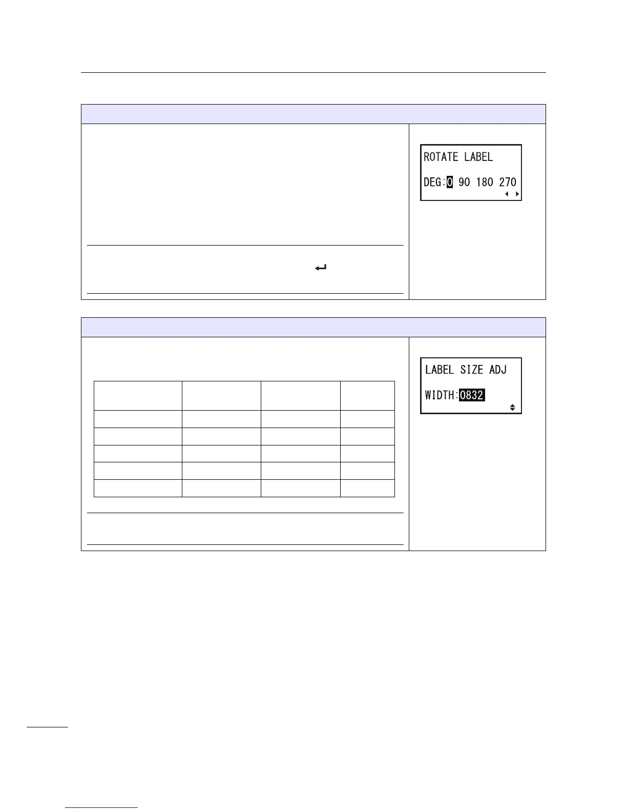 The LABEL SIZE ADJ screen shows if you press the ENTER button