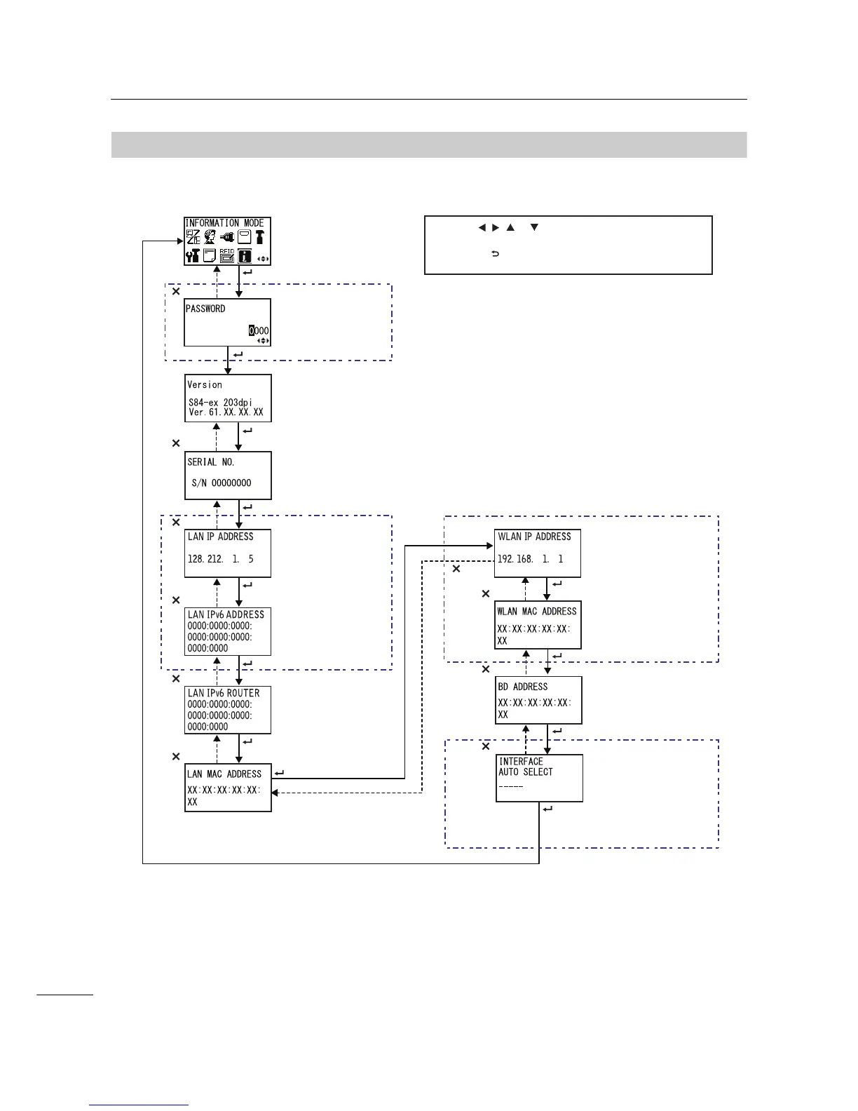 The flowchart shows the sequence of the setting screens for the information mode. The table describes