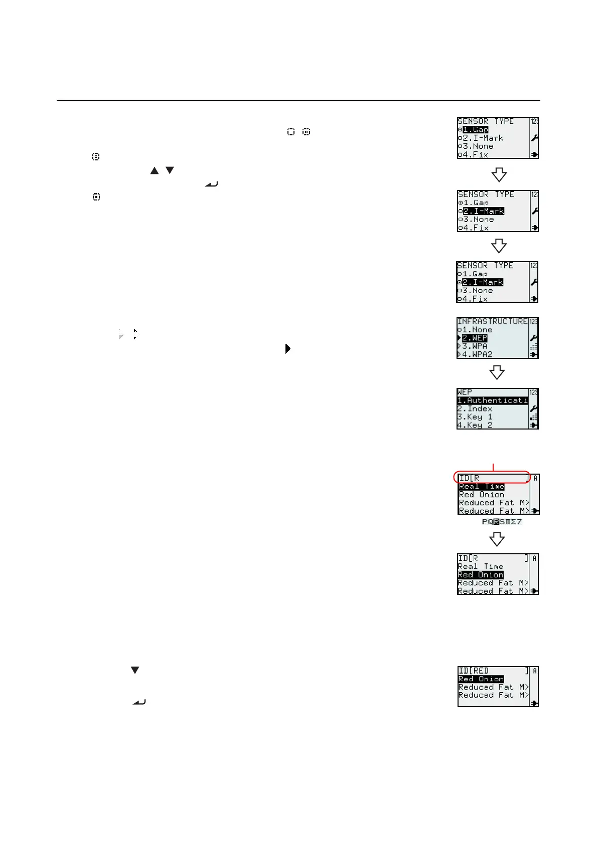At the lowest level of the SETUP menu tree, the , radio button icons are