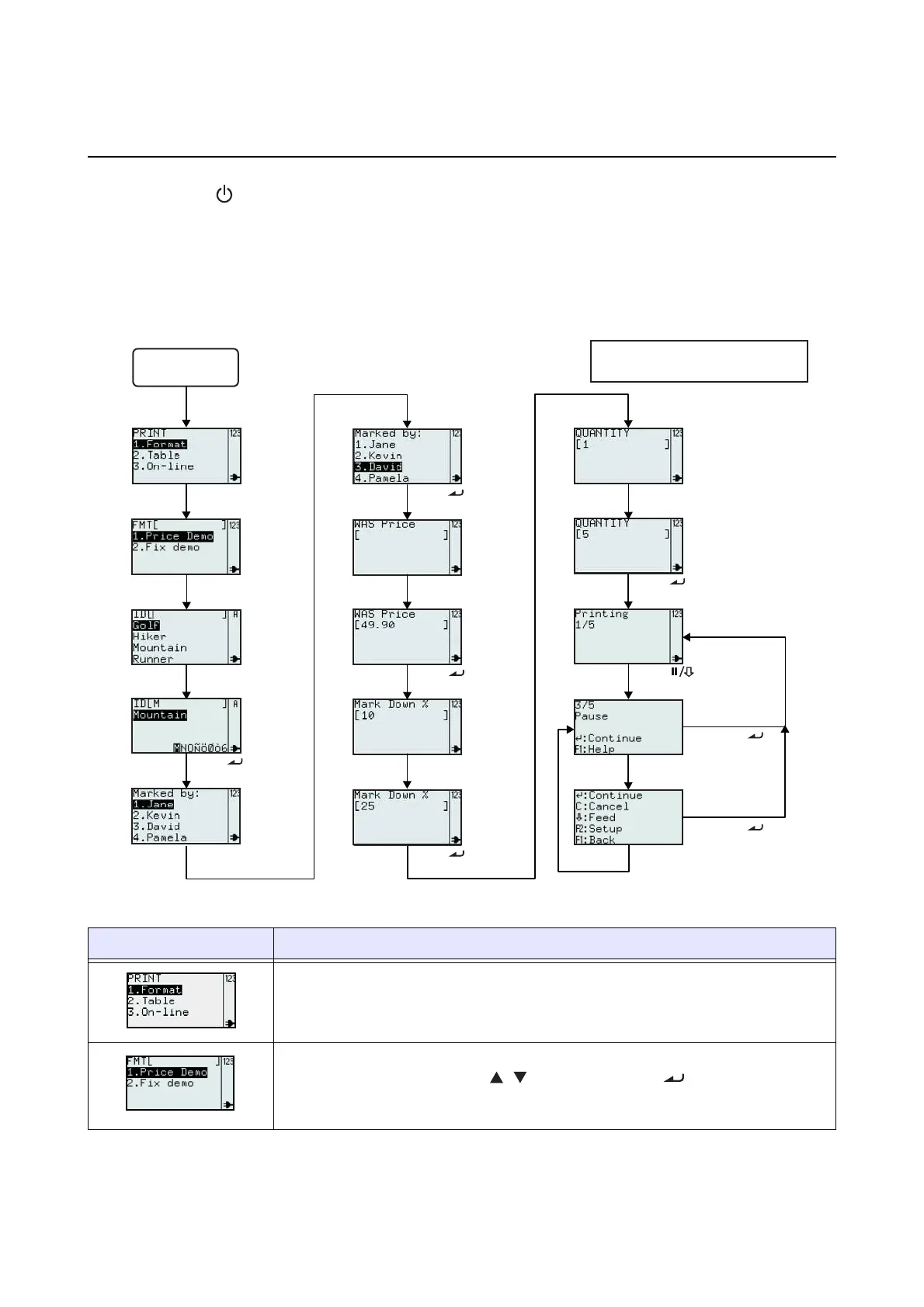 After pressing the power button, the printer displays the PRINT menu after the start-up display. The