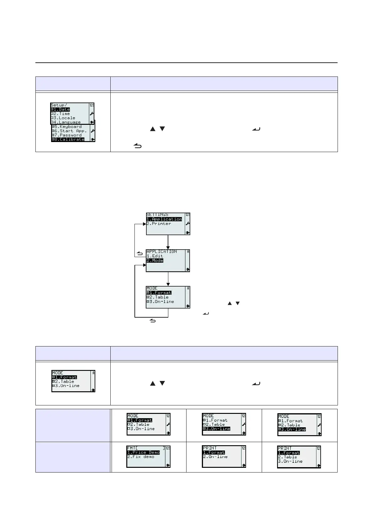 You can set the appearance of PRINT menu in 2.Mode selection of APPLICATION menu. Format, Table or