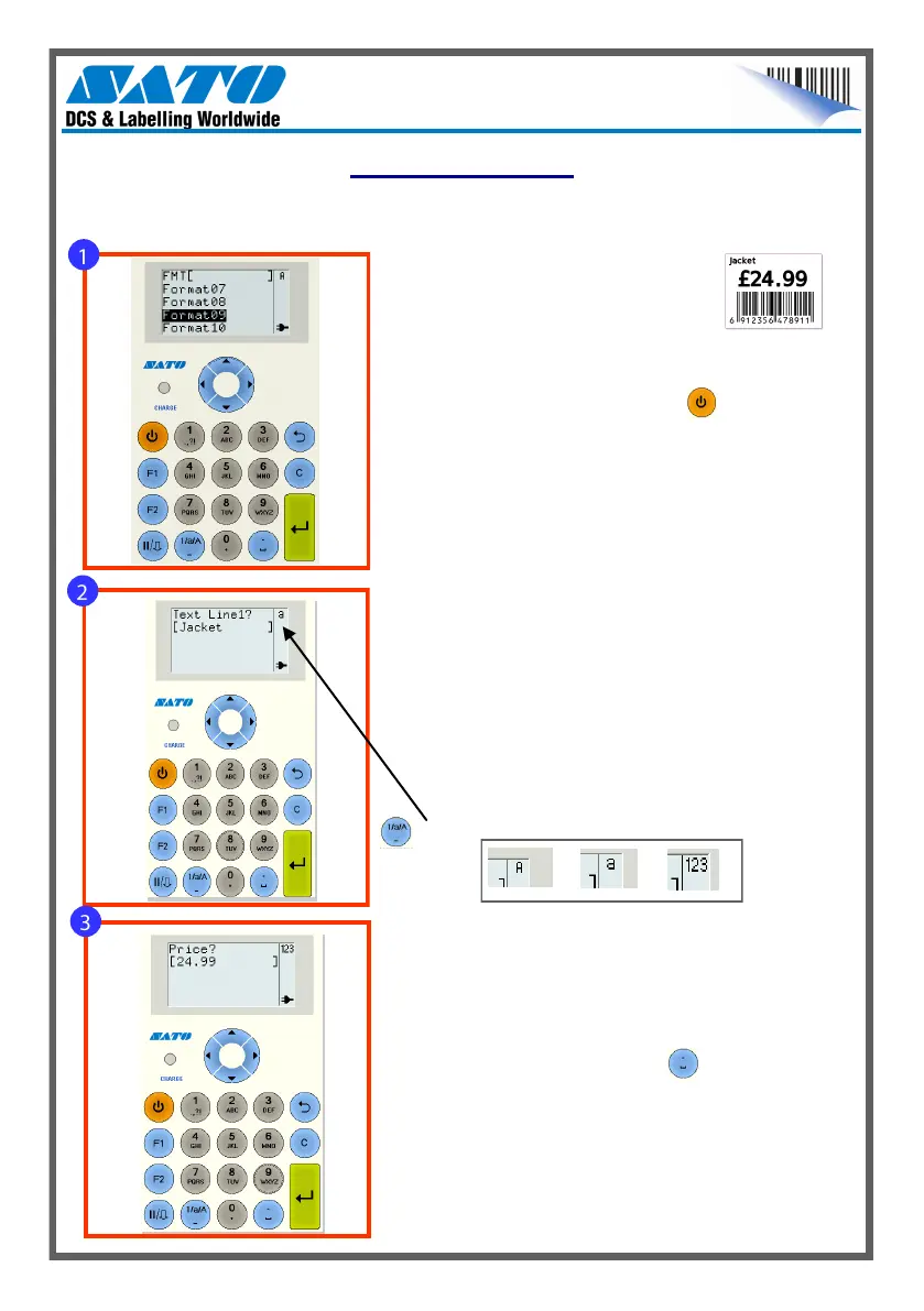 screen prompts. Label Format 9, text, price and barcode is used in this example.