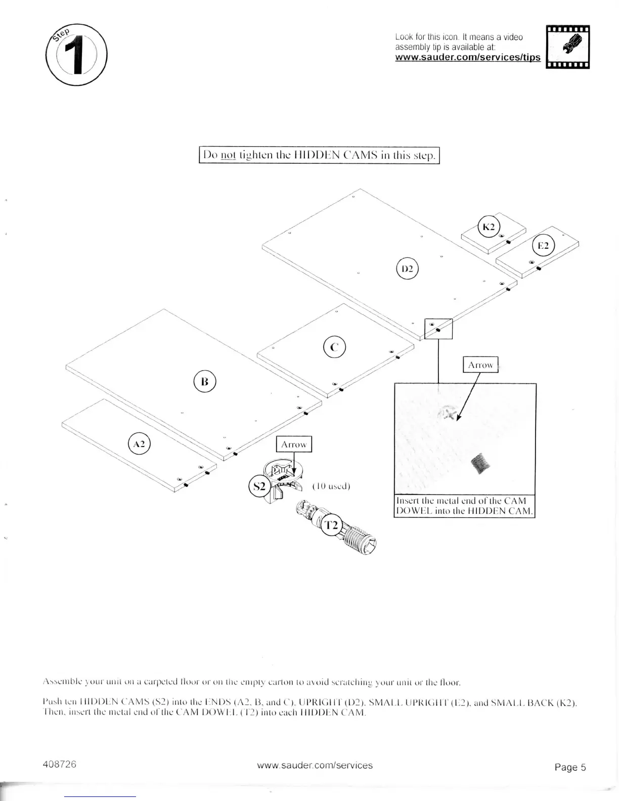 Sauder 408726 - Step 1: Initial Cam Assembly; Hidden Cam Tightening Caution