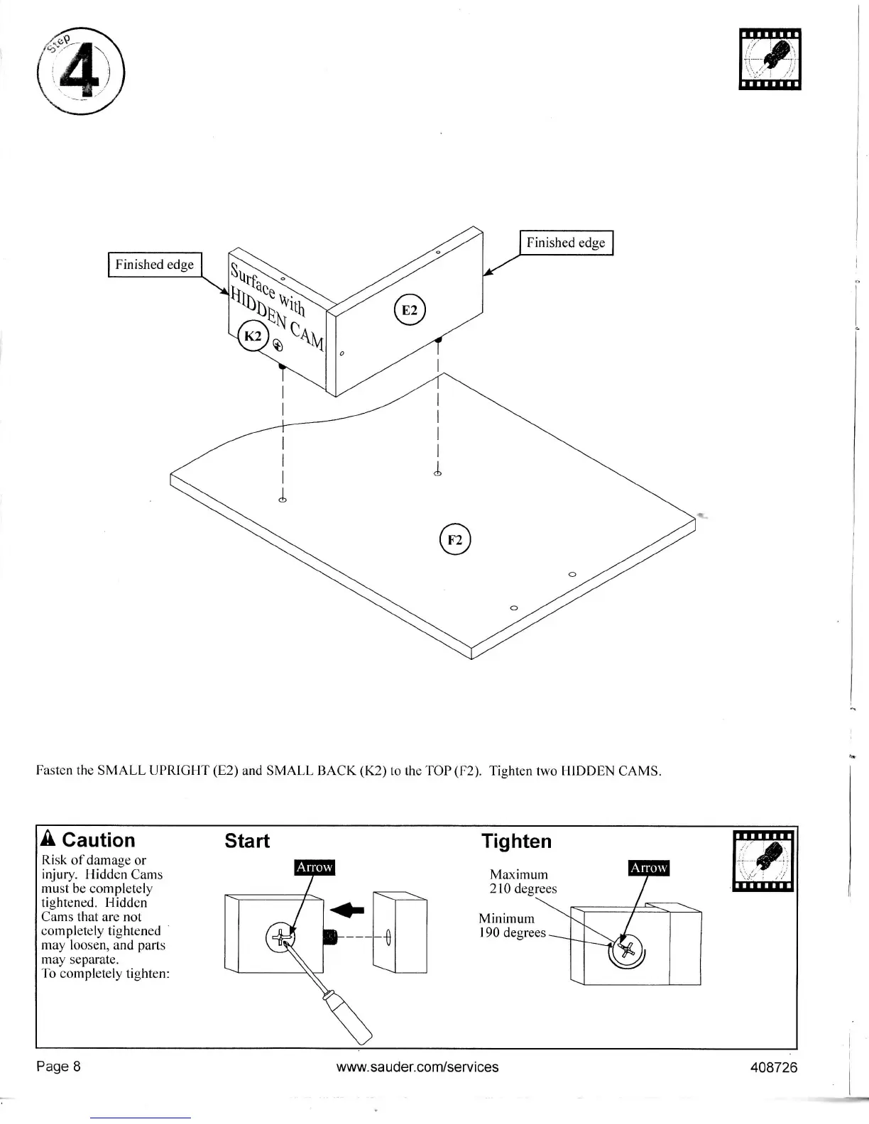 Sauder 408726 - Step 4: Attach Small Upright and Back to Top; Hidden Cam Tightening Procedure