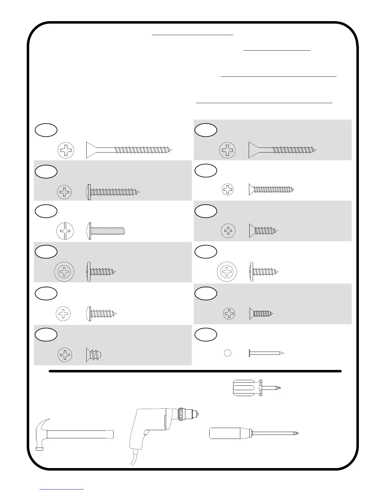 El uso de un TORNILLO demasiado largo causará daño. Antes de comenzar el ensamblaje, separe cada tipo de TORNILLO.