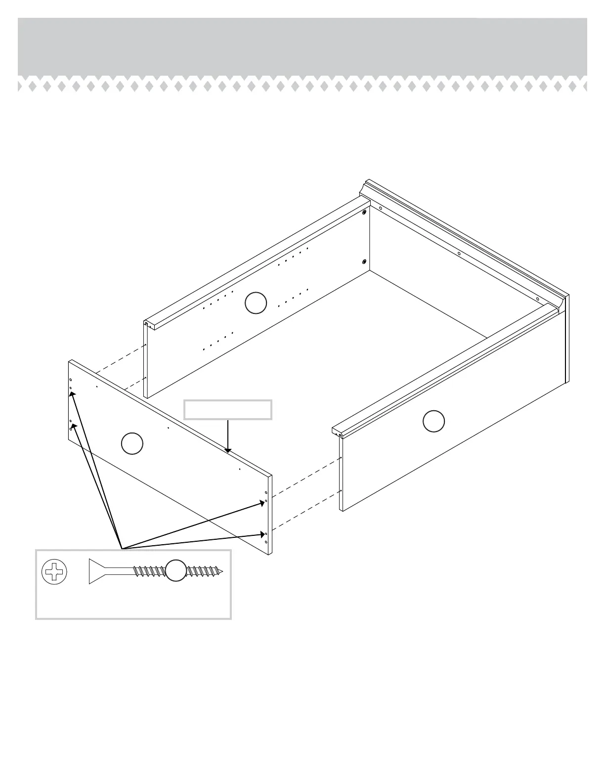 Fasten the SHELF (G) to the ENDS (A and B). Use four
