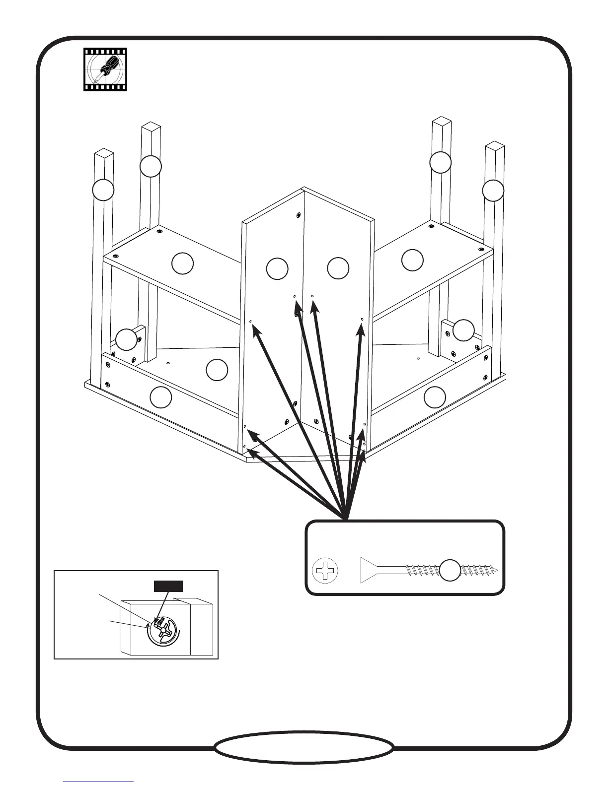 Fasten the ENDS (A) to the TOP (D). Tighten four HIDDEN CAMS.