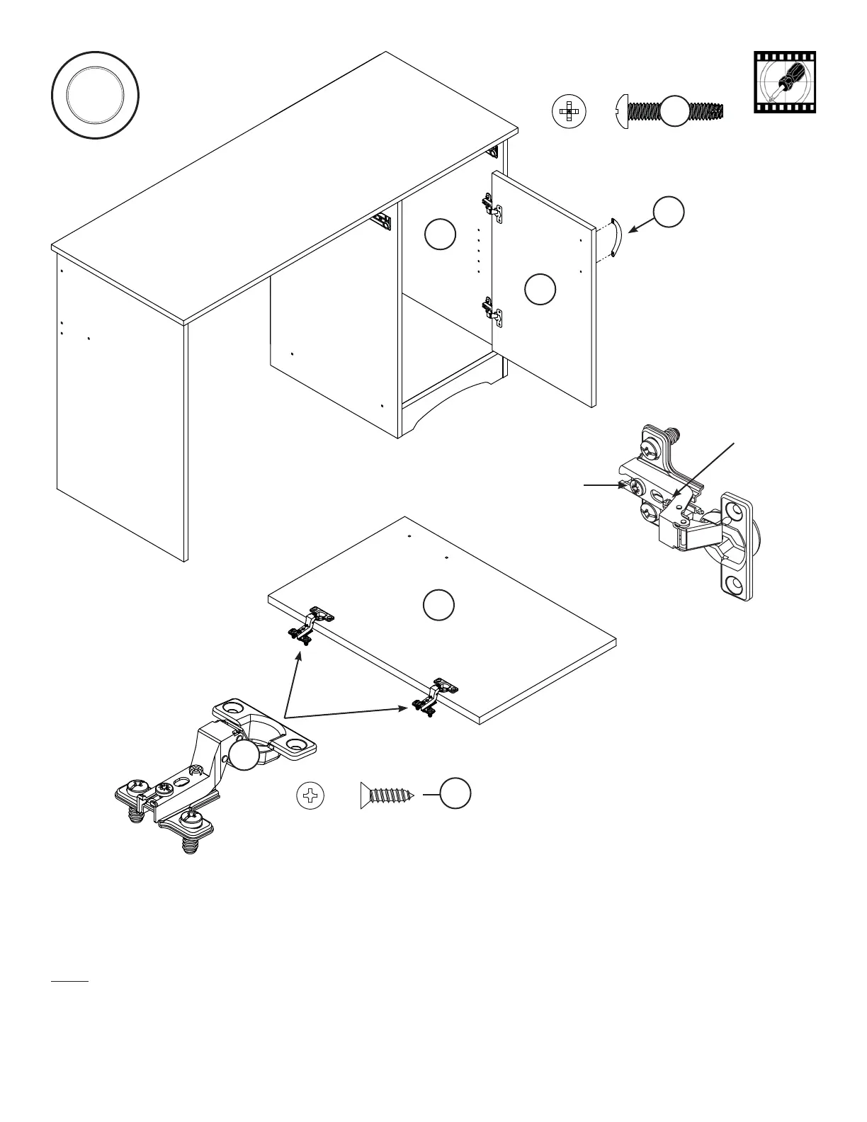 Fasten the DOOR (J) to the RIGHT END (A). Use the screws in the HINGES. See the next step for door adjustments.