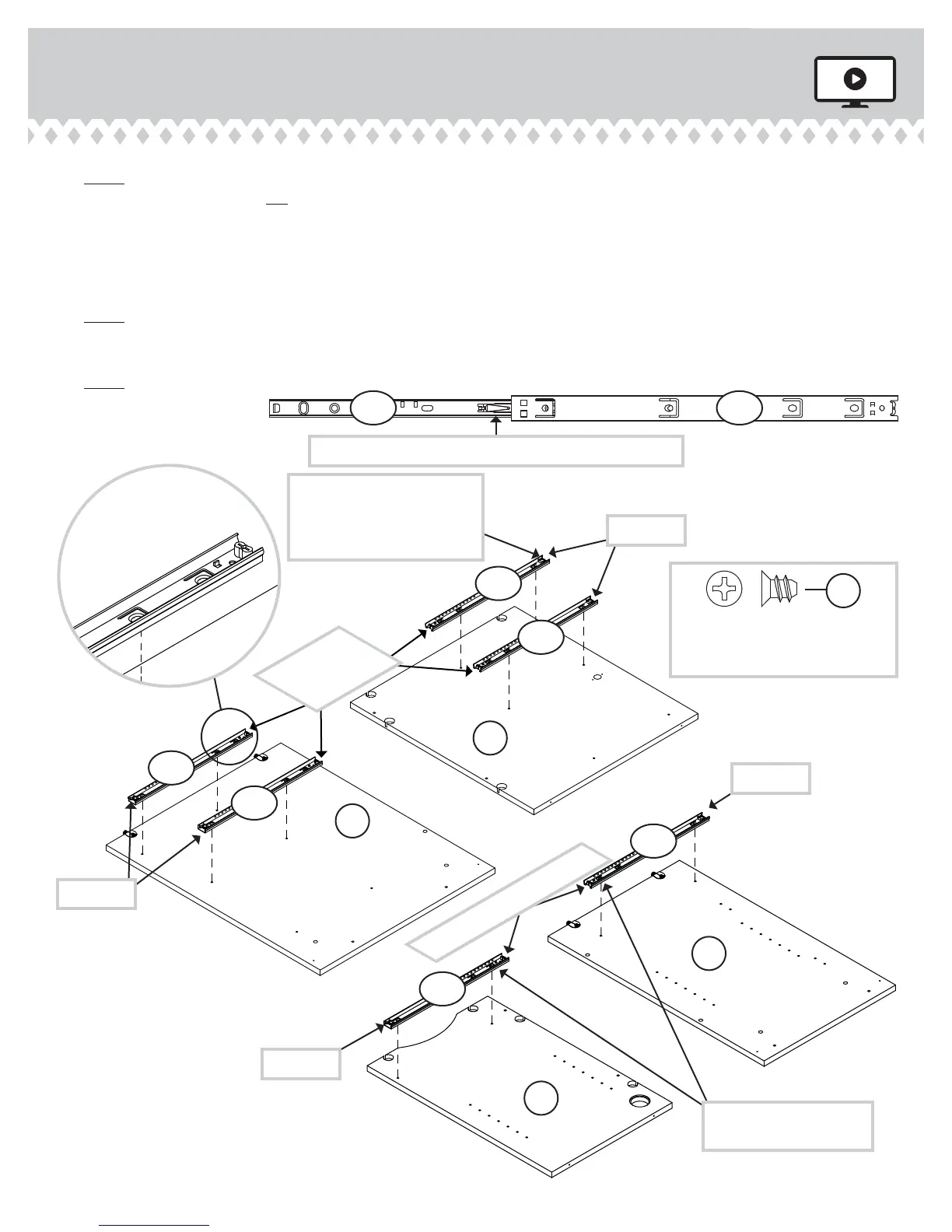NOTE: For each EXTENSION RAIL, turn a SCREW into the hole shown in the enlarged diagram. Then, slide the inner