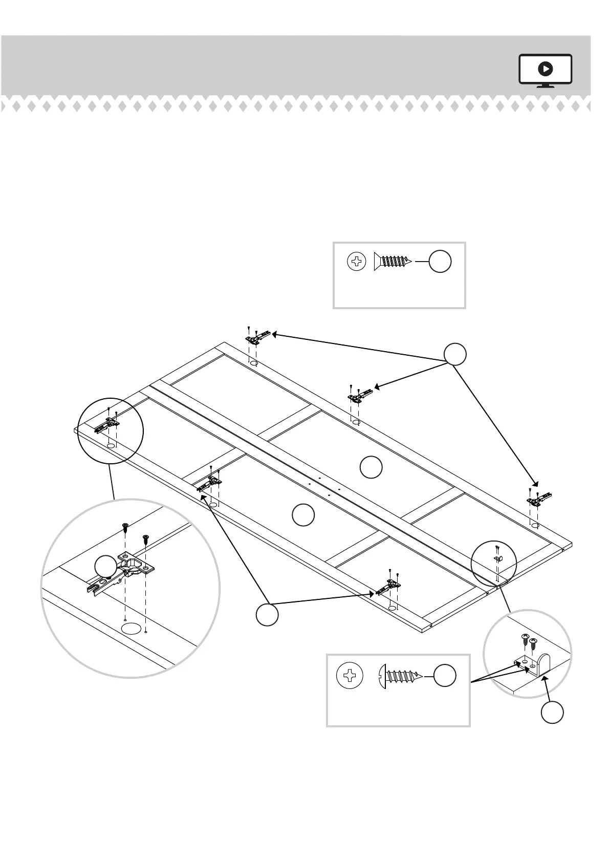 Fasten the HINGES (2) to the DOORS (H and I). Use