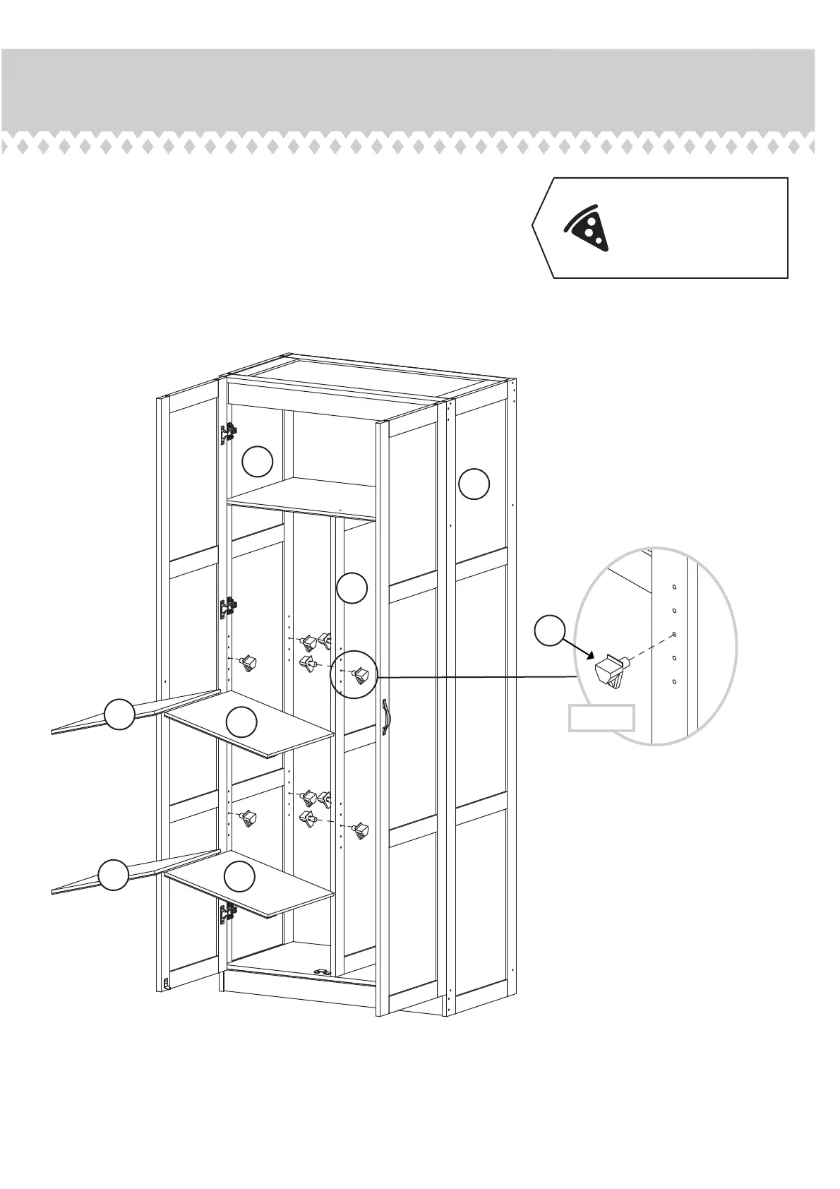 Insert the SHELF SUPPORTS (11) into the hole locations of