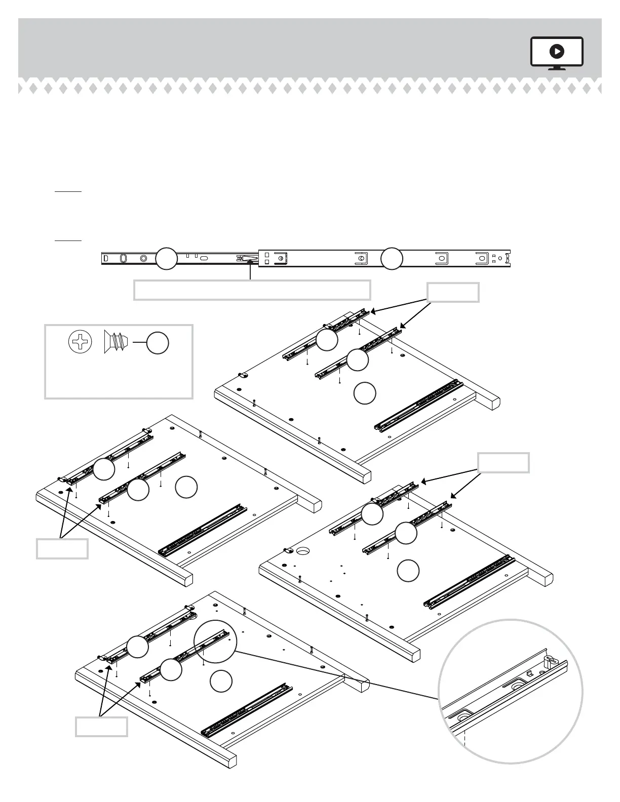 NOTE: For each NARROW EXTENSION RAIL, turn a SCREW into the hole shown in the enlared diaram. Then, slide the