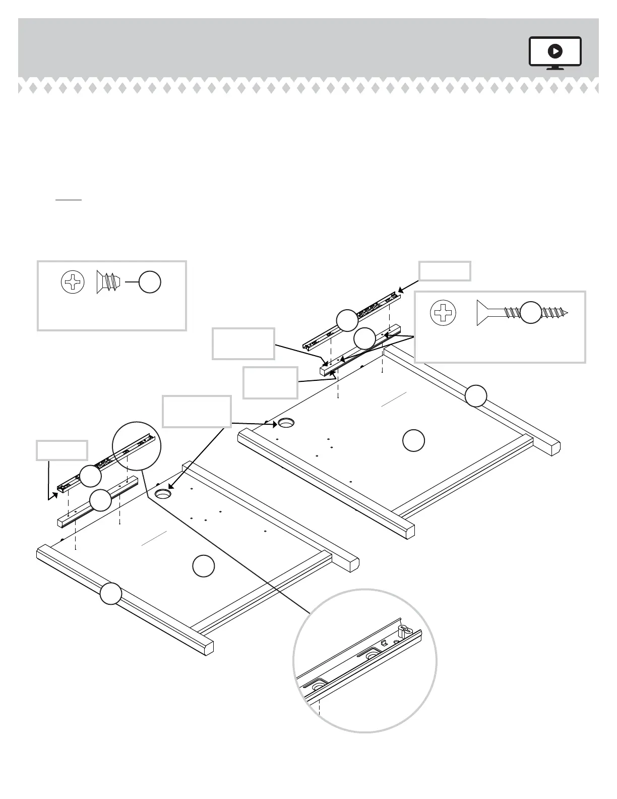 NOTE: For each NARROW EXTENSION RAIL, turn a SCREW into the hole shown in the enlared diaram. Then, slide the