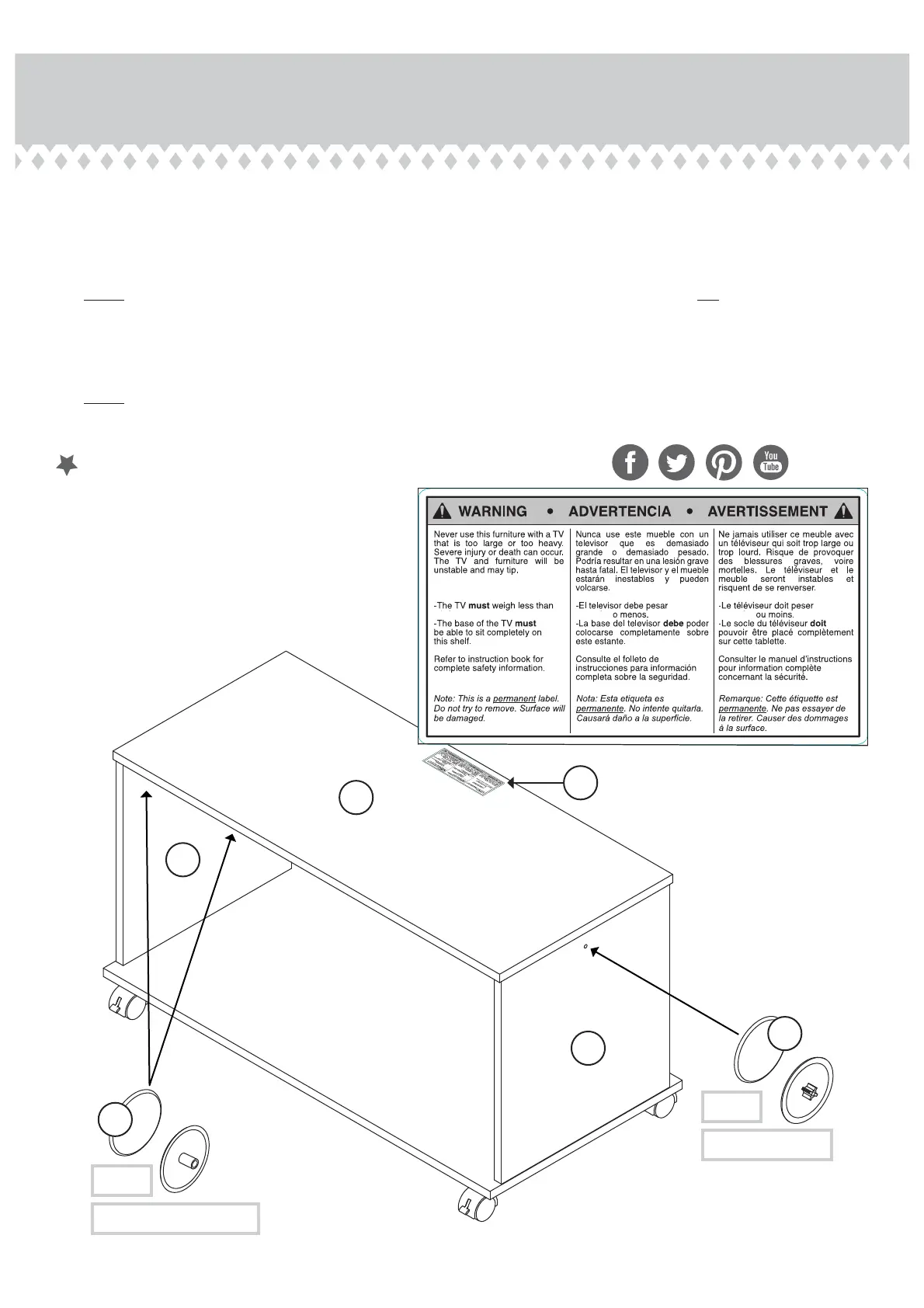 Apply the WARNING LABEL (6) to the TOP (B). You should be able to read the label when the TV is removed from the