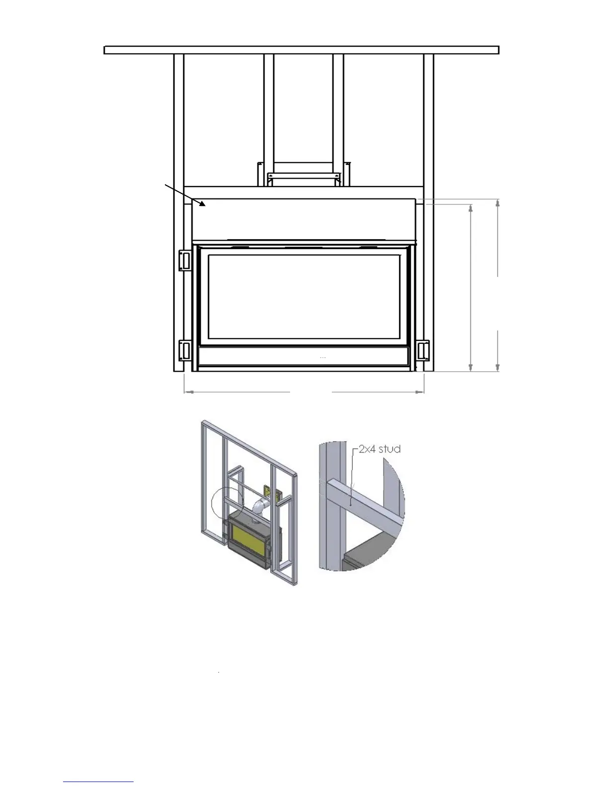 The closest combustible material above the fireplace must be a minimum of 32.50” from the floor with the stud