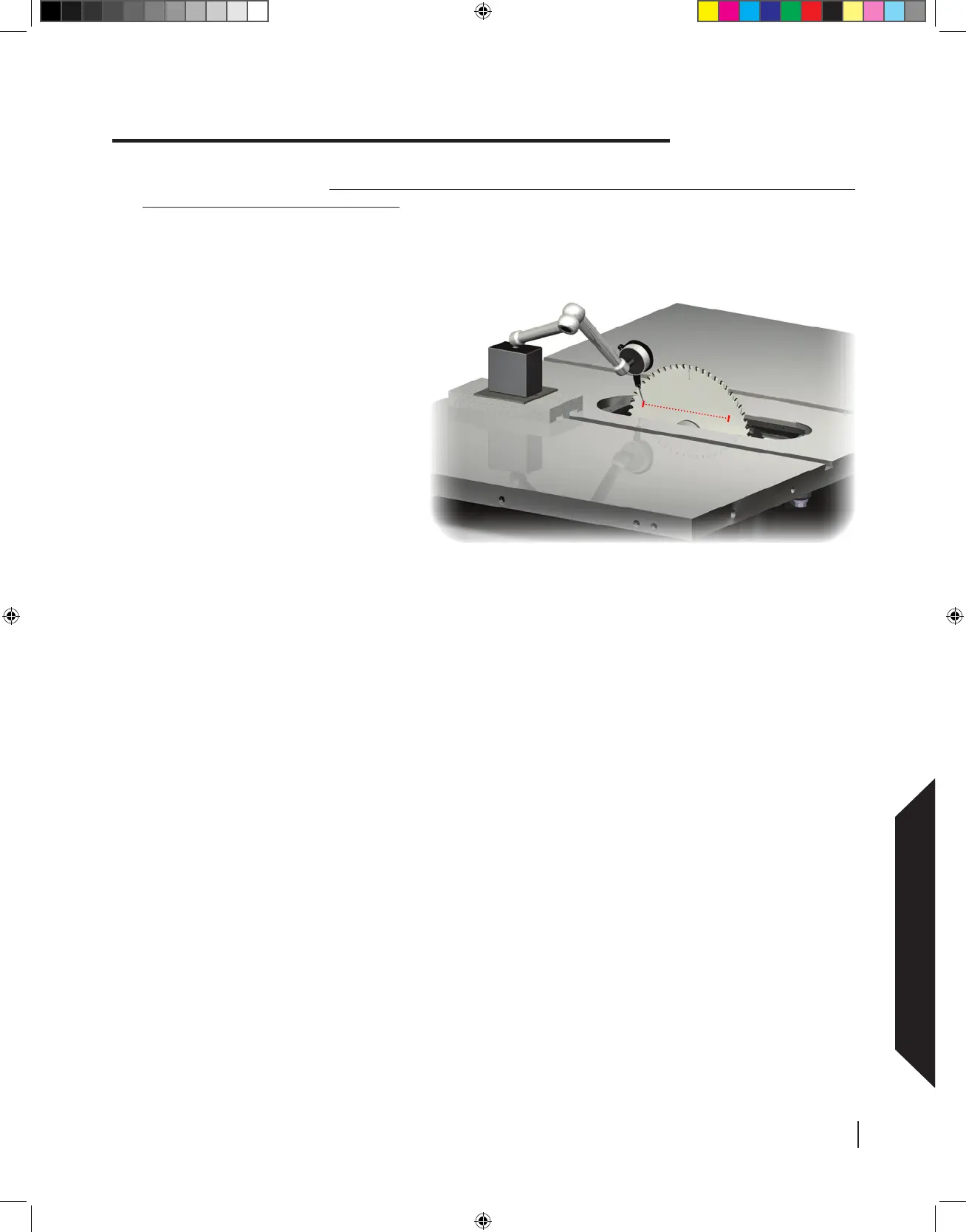 and reset the indicator to zero. Now slide the mount toward the back of the saw again while noting the dial