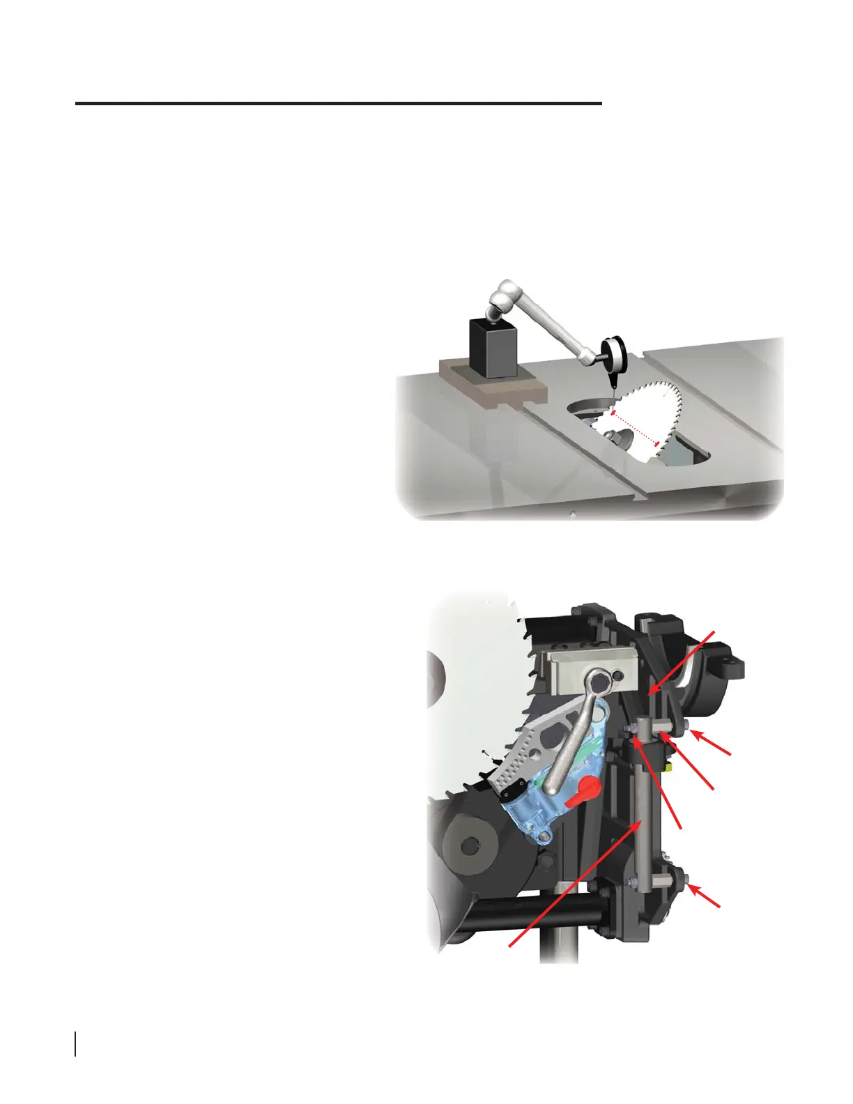 fl ange. Slide the dial indicator mount toward the front of the saw until the measurement arm is about