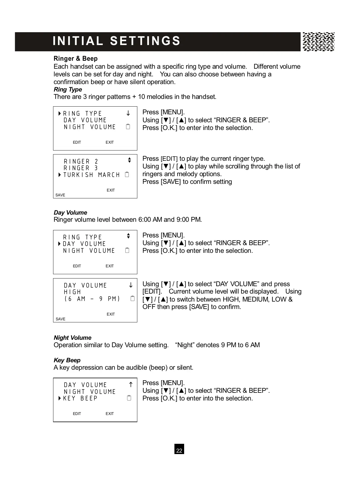 Using [▼ ] / [▲ ] to select “RINGER & BEEP”.