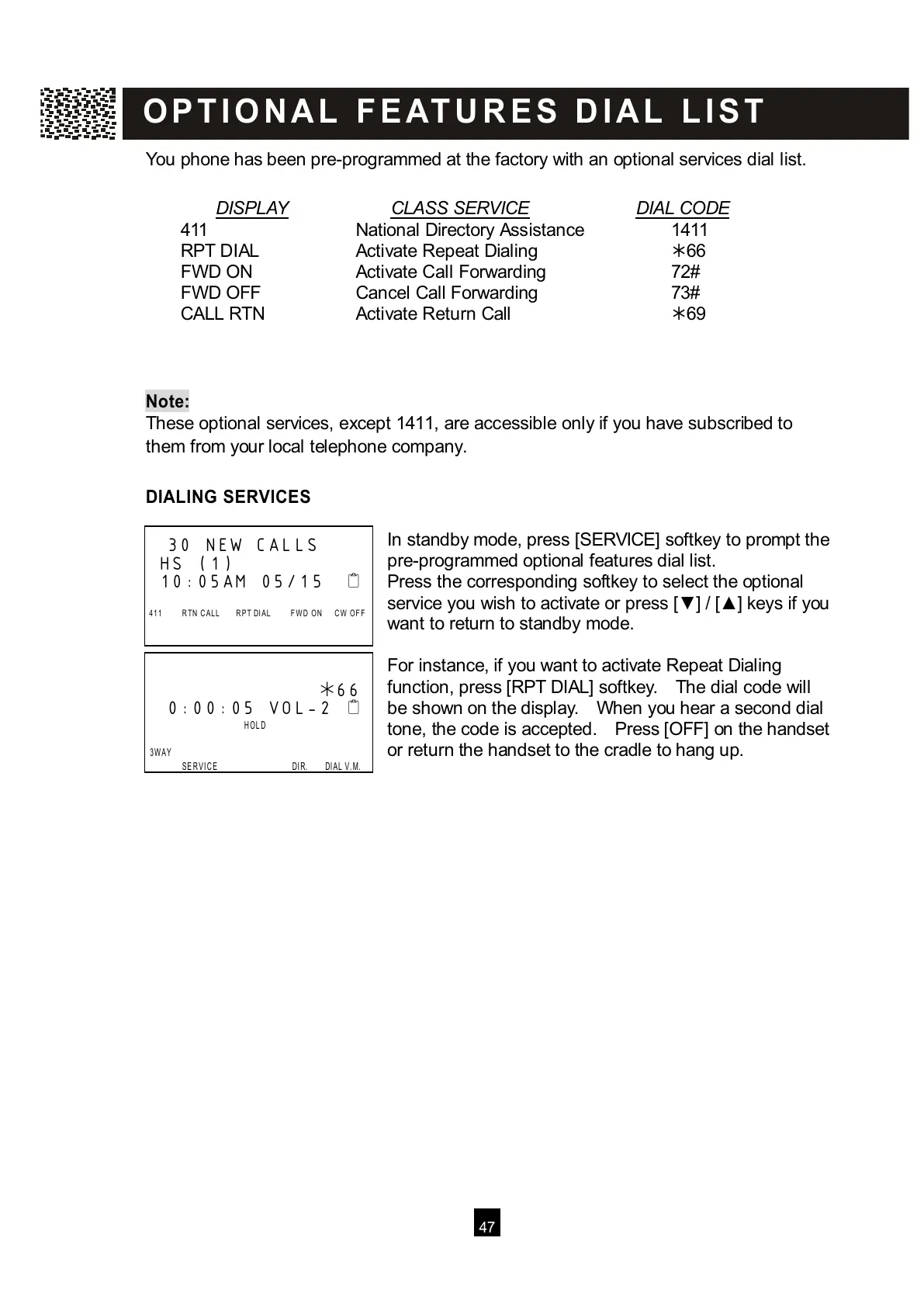 You phone has been pre-programmed at the factory with an optional services dial list.