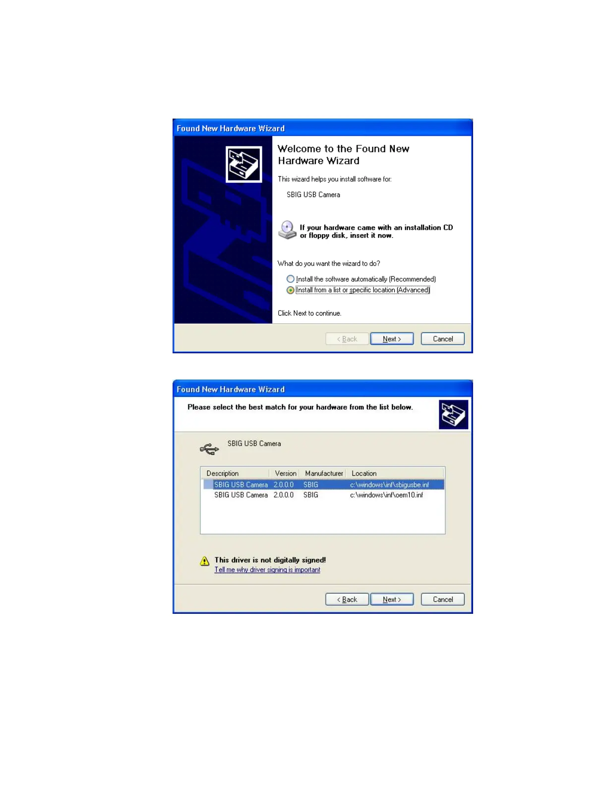 8. Again you will be presented with the Found New Hardware wizard for the SBIG USB
