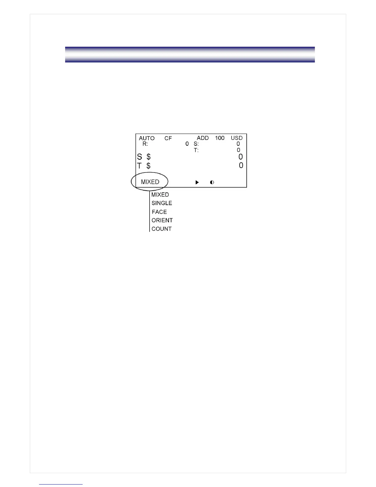 In Mixed mode, the machine counts and discriminates the denominations of the bank notes. If