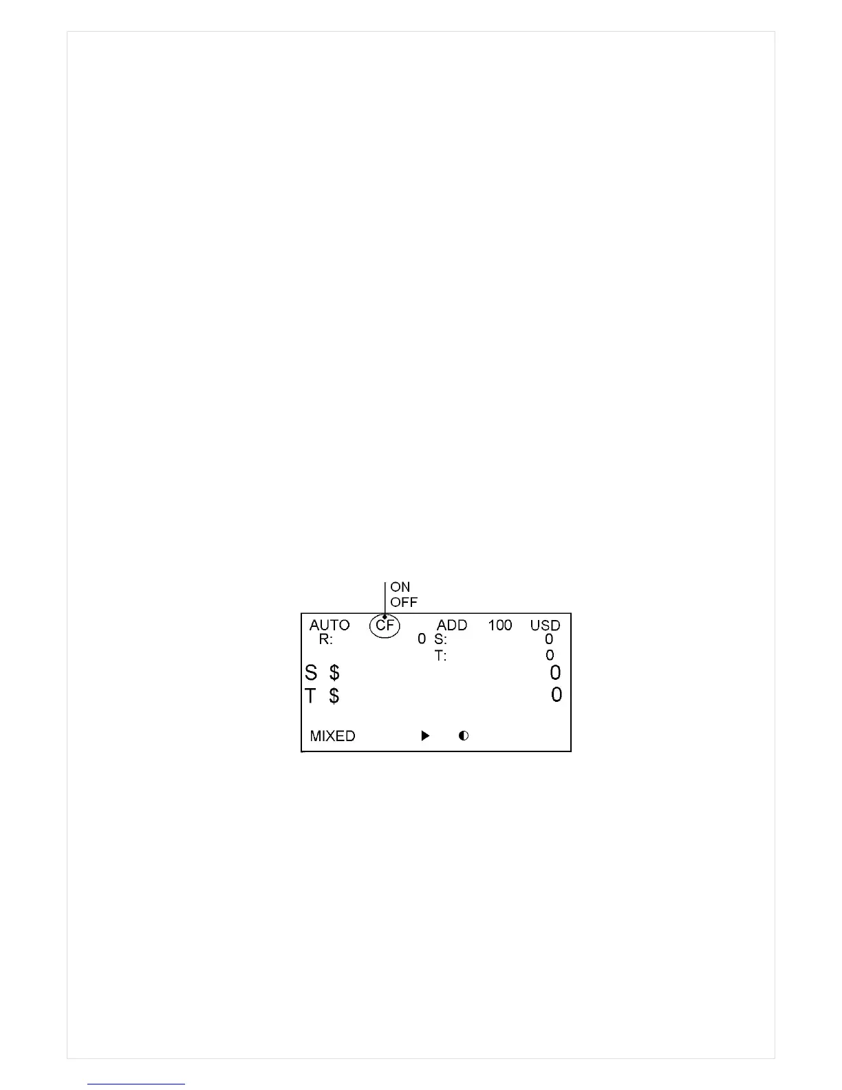 Counterfeit detectors are turned on or off by pressing CF key. If CF is turned on, “CF” will be lit