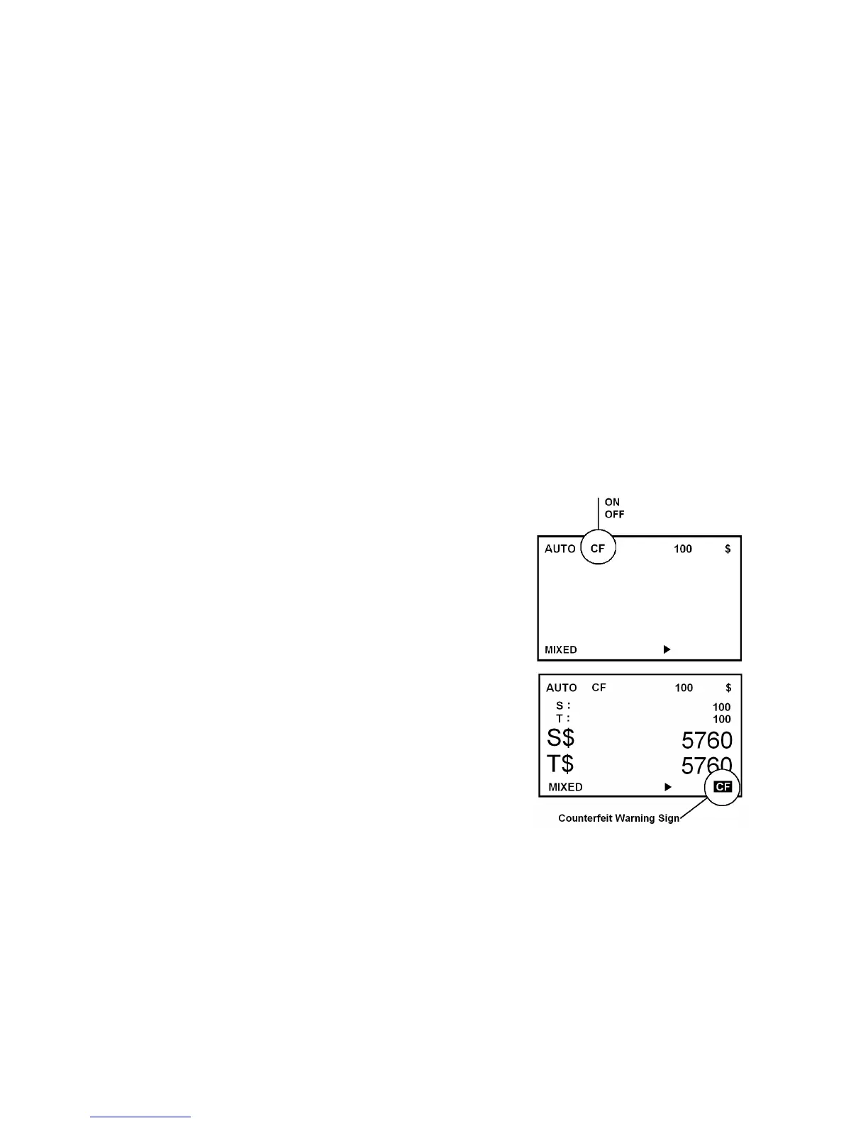 If a note is determined as a counterfeit, CF sign will be lit on LCD as the