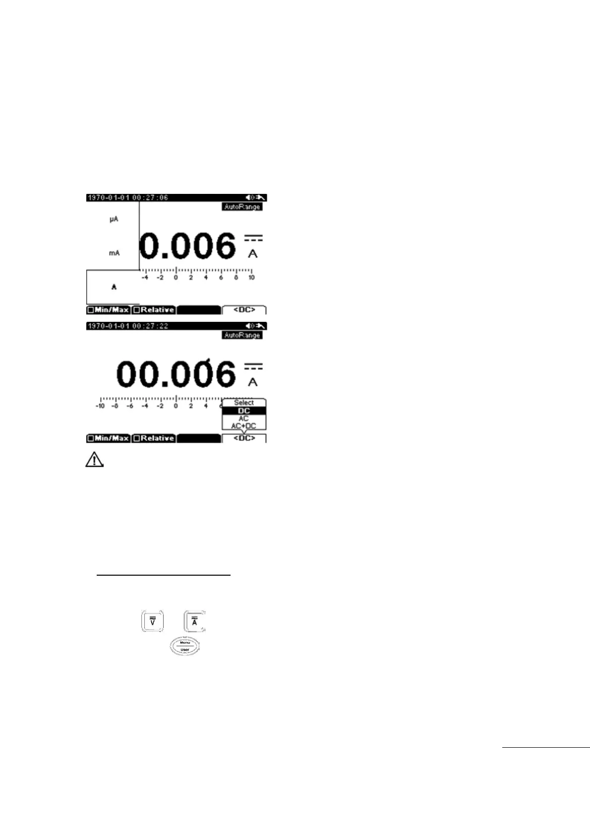 Selectable sub menu: Min/Max, Relative, ㏈m, DC, AC, DC+AC