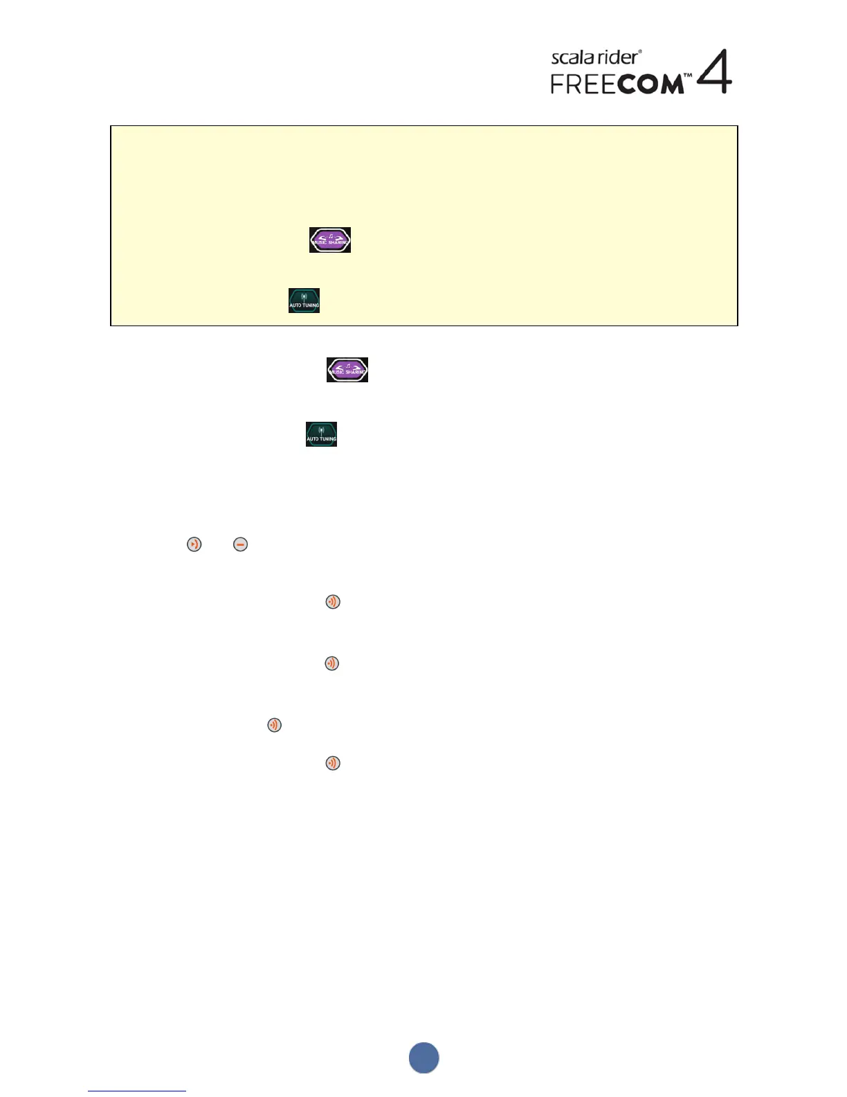 ● FM radio or music - press for 2 seconds. If FM radio was shared, the Bluetooth intercom call remains