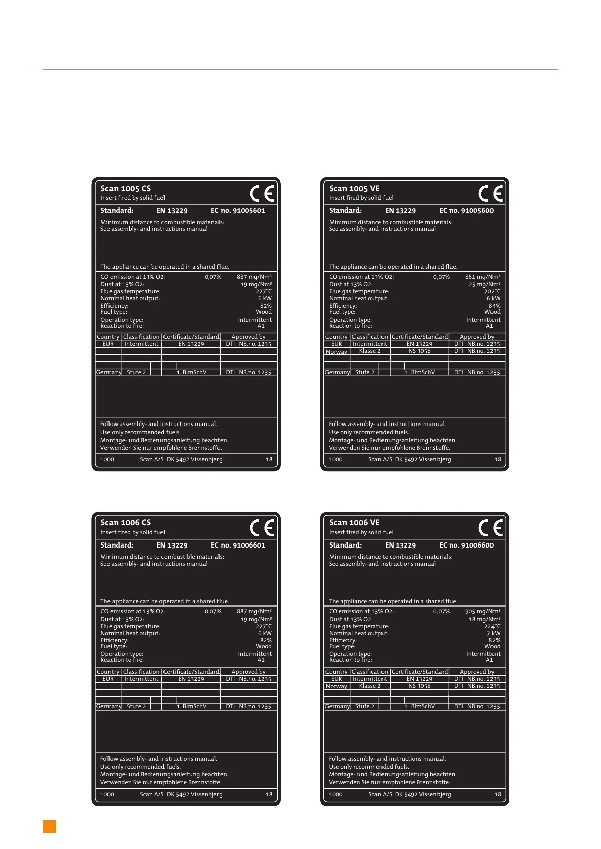 All Scan built-in stoves are fitted with a type plate that specifies the approval standards and the distance to flammable materials.