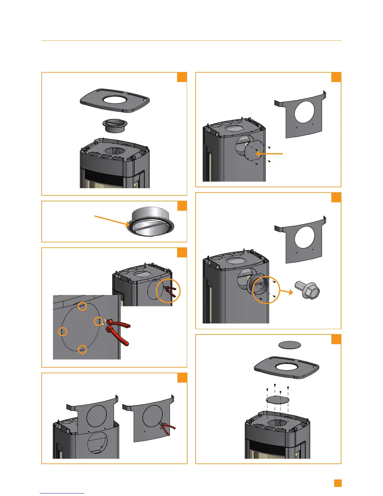 The connecting piece is placed loosely in the top outlet of the stove. The gasket for the connecting piece and the screws for
