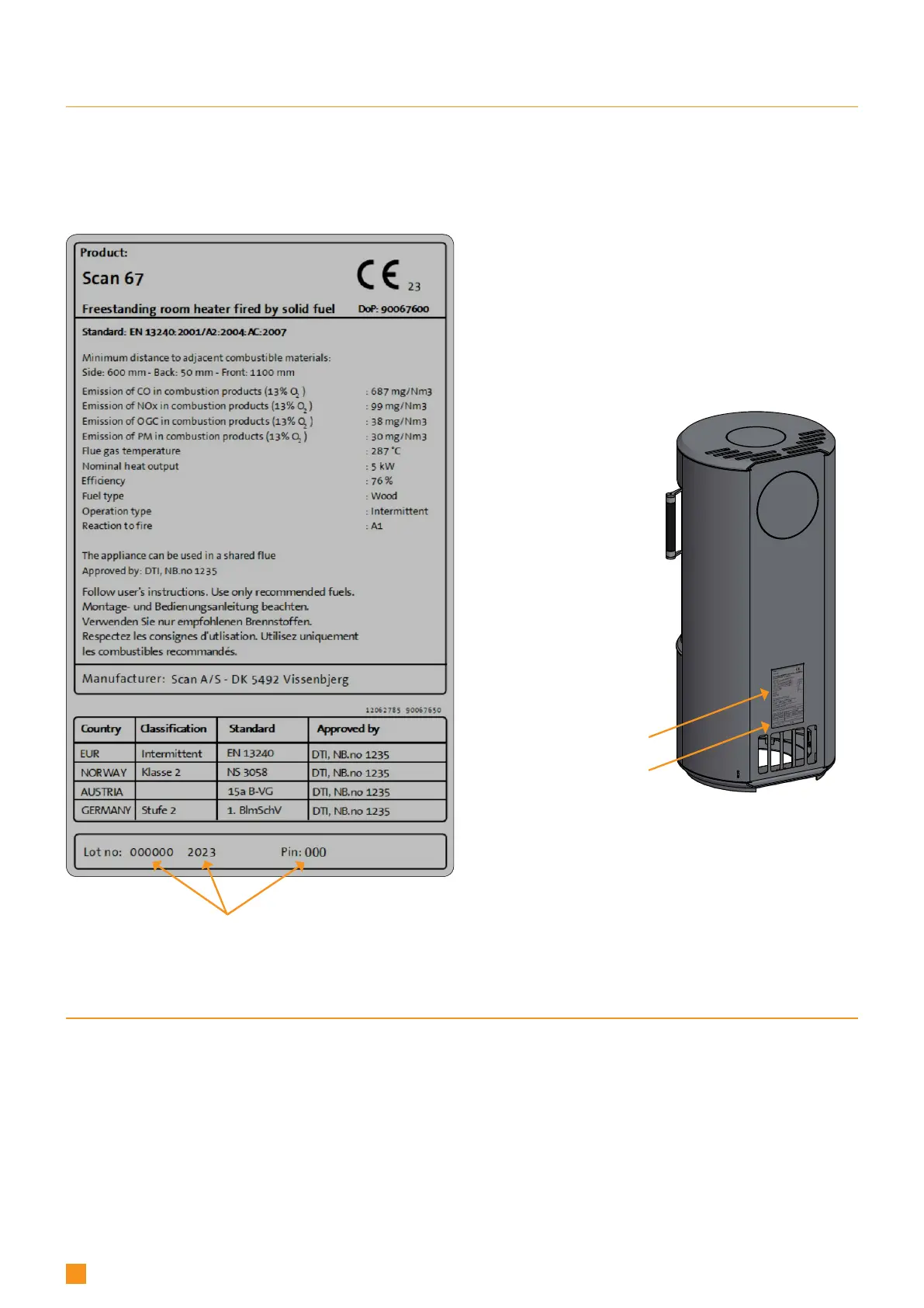 All Scan wood-burning stoves are fitted with a type plate that specifies the approval standards and the distance to flammable